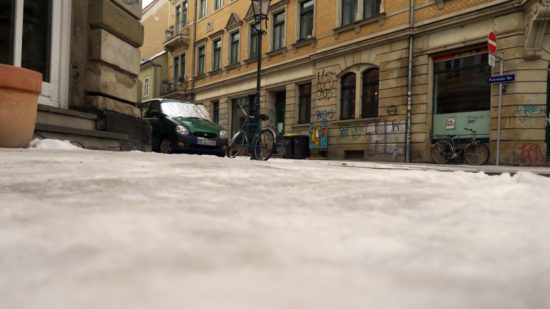 So manches Haus braucht aber noch einen ganz anderen Hinweis: „Vorsicht frisch geeist!“ – das wäre zum Beispiel an der Louisen-/Ecke Pulsnitzer Straße angesagt. Dort konnte man heute Fußgänger bei einem kleinen Eiertanz beobachten.