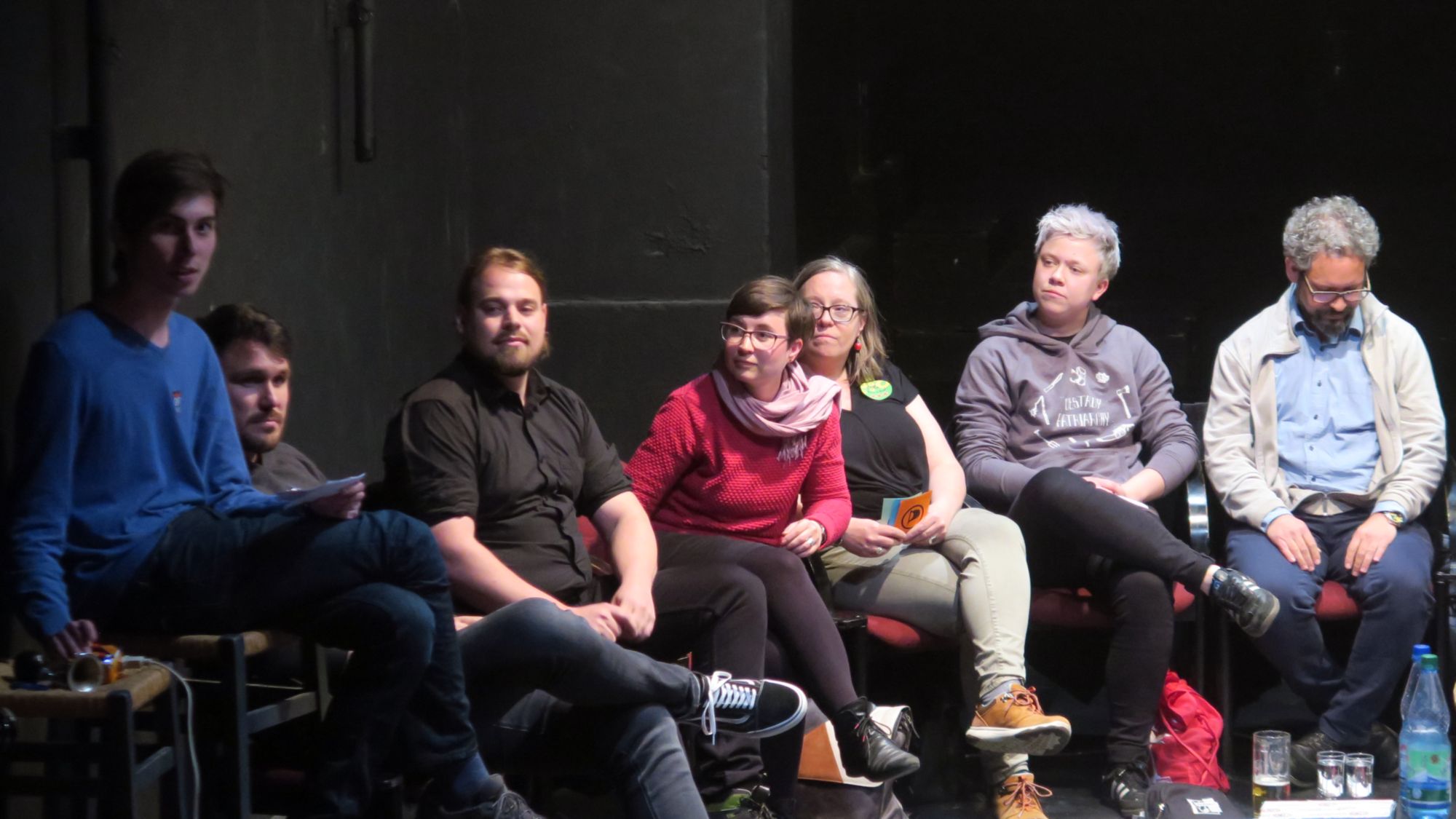 Die Piraten hatten zum politischen Schlagabtausch ins Projekttheater geladen. Das Theater war bis auf die Treppe gut gefüllt. Die Kandidat*innen hatten je Antwort immer 60 Sekunden Zeit und einige Joker, wie Widerspruch und Verlängerung. Mittels Buzzer und einer bunten Leuchtleiste navigierte der Moderator einem Quiz-Master gleich durch den Abend.
