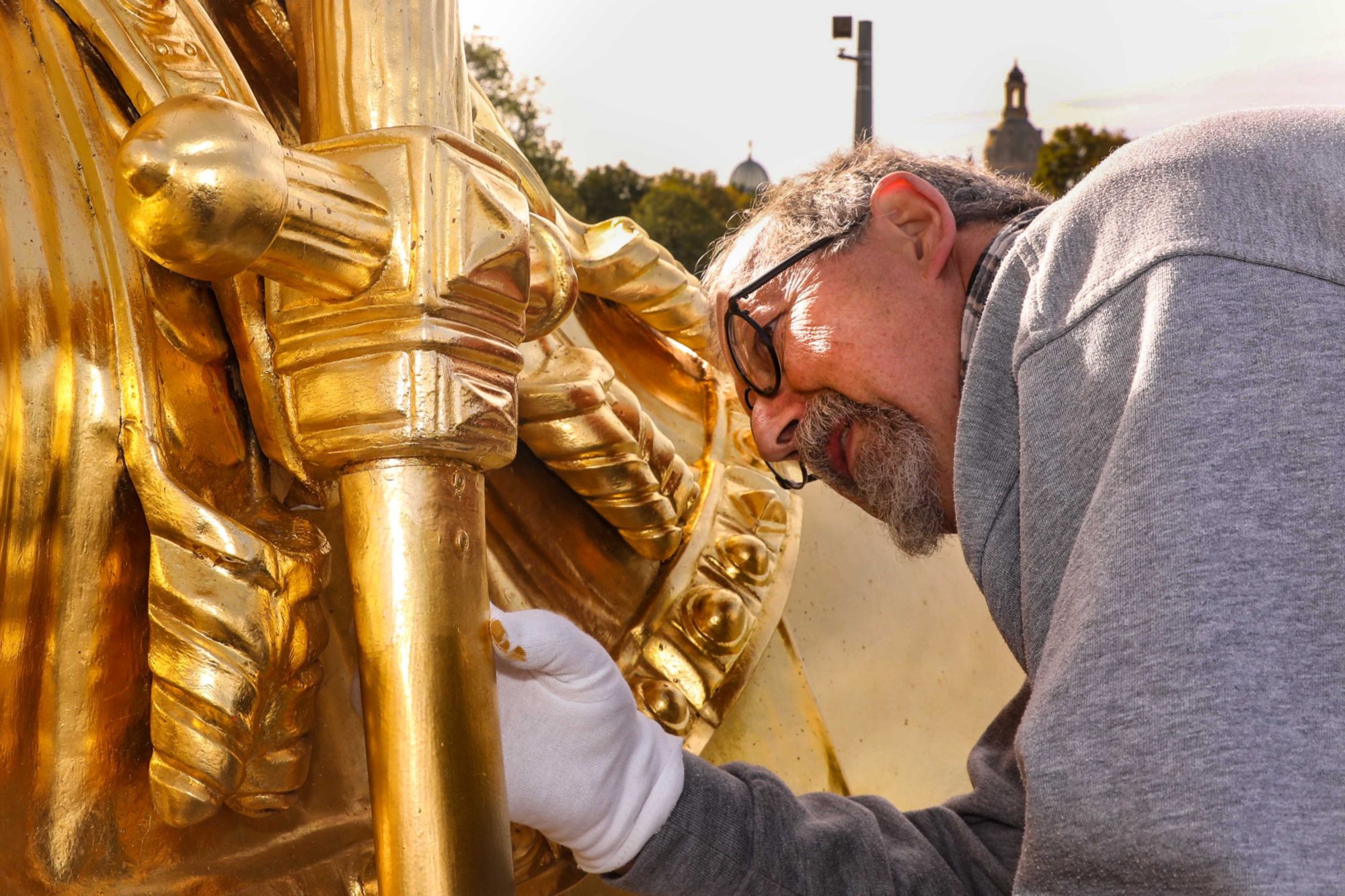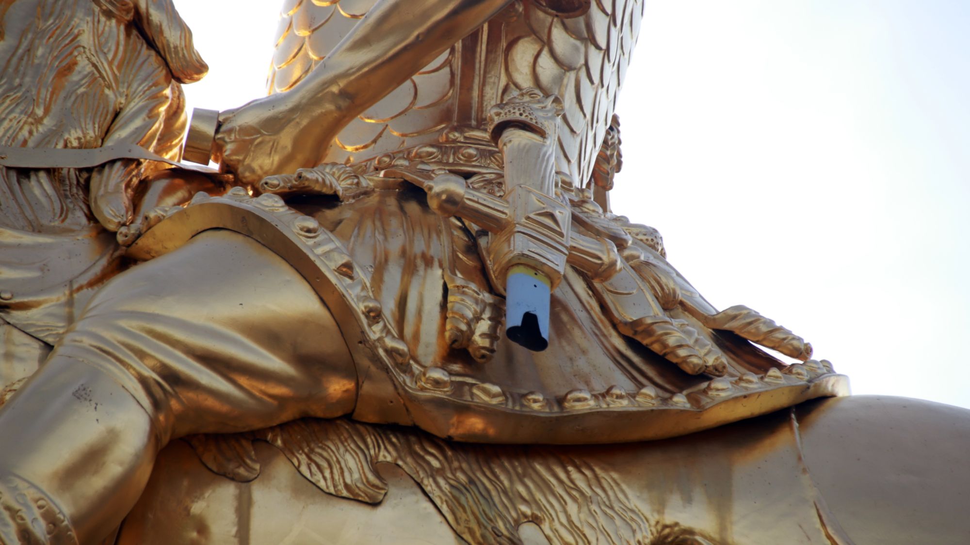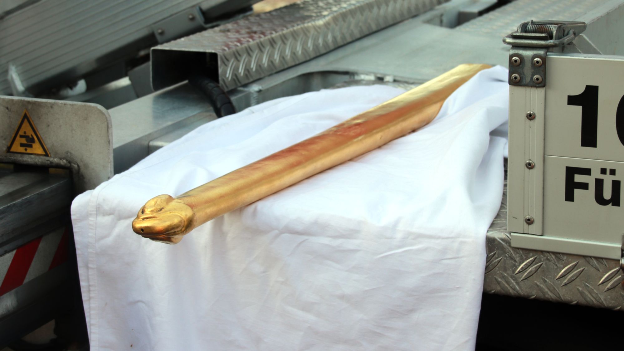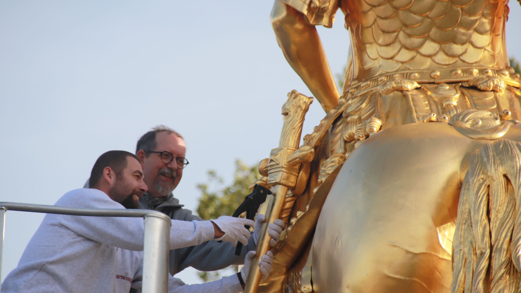 Straßburger kümmert sich seit 2001 um das mit Blattgold beschichtete Reiterstandbild. Damals wurde es komplett saniert. Die aktuelle Reparatur und die Verstärkung der Manschette haben 9.300 Euro gekostet, berichtet der Bürgermeister.