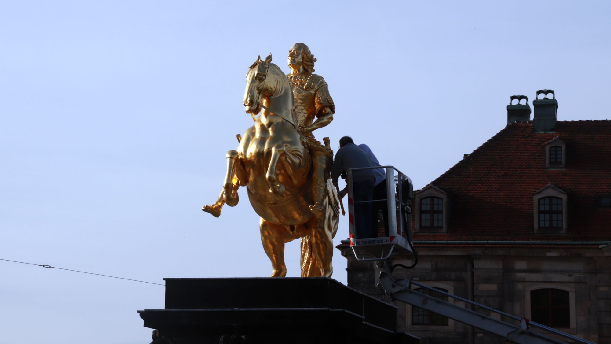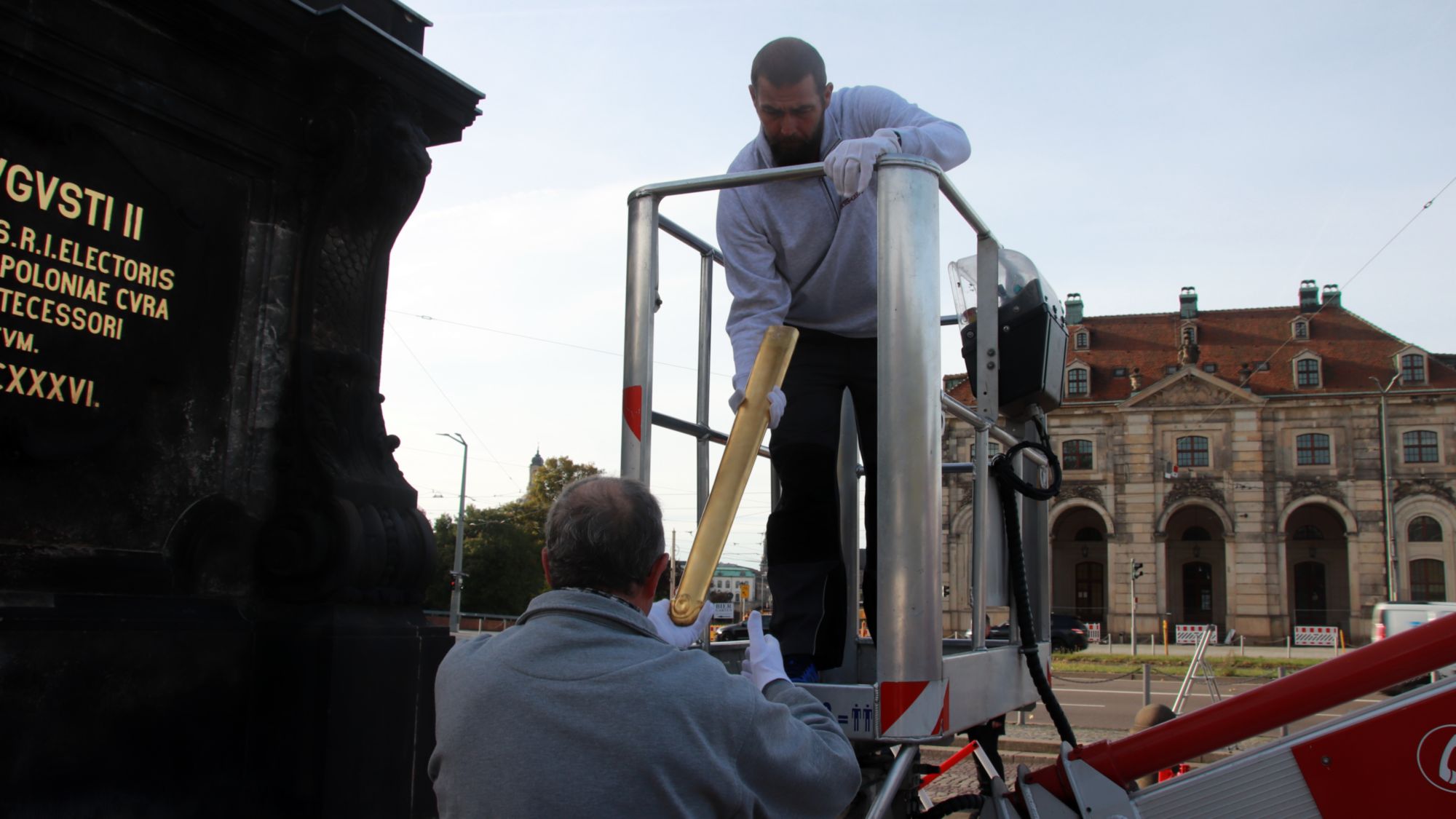 Großer Medienauflauf am Morgen am Neustädter Markt. Der „Goldene Reiter“ ist wieder komplett. Die Restauratoren der Firma Fuchs & Girke haben in aufwändiger Handarbeit in den vergangenen fünf Monaten die Schwertscheide des Reiterstandbildes wieder repariert. Heute wurde das gute Stück wieder am Denkmal angebracht.