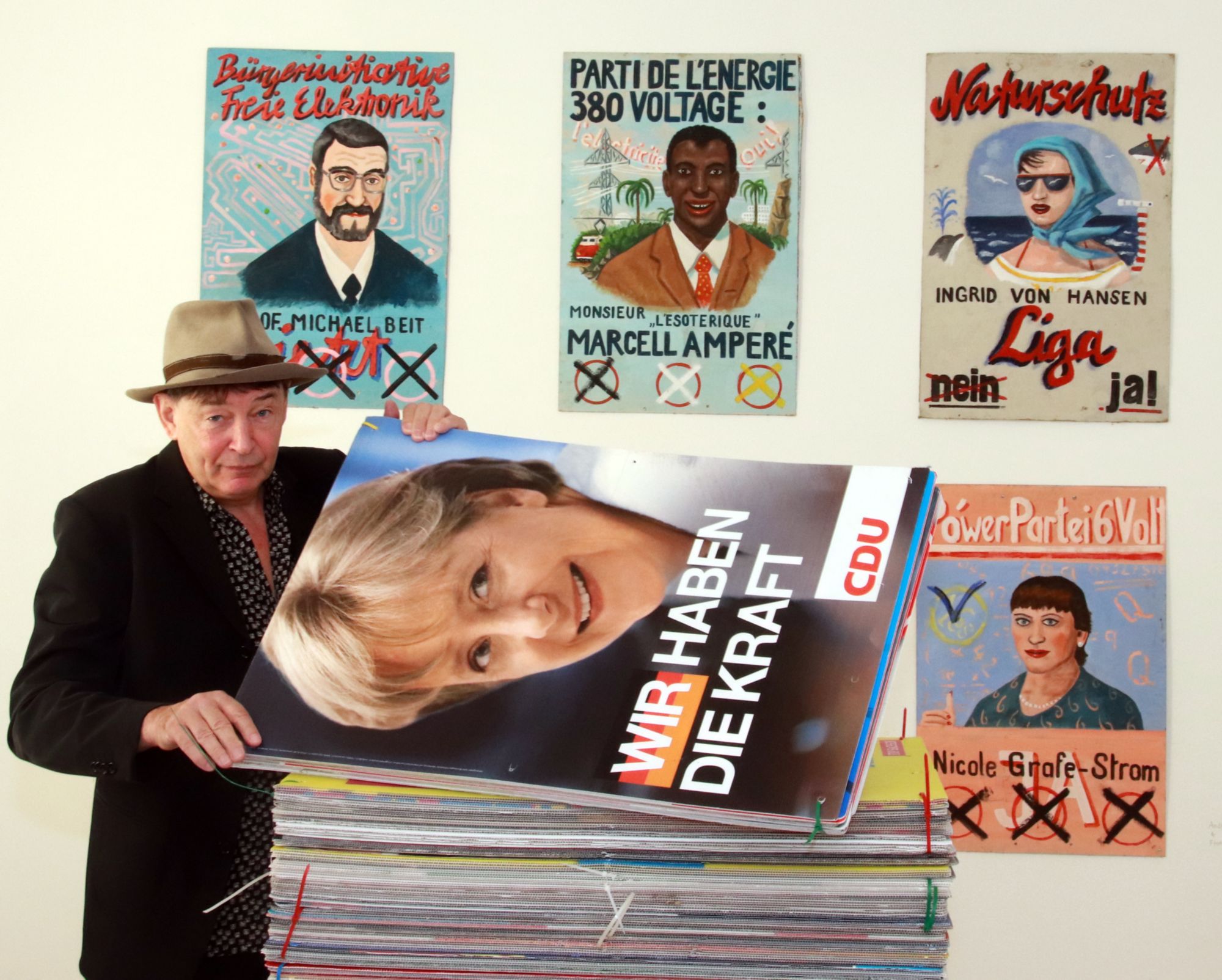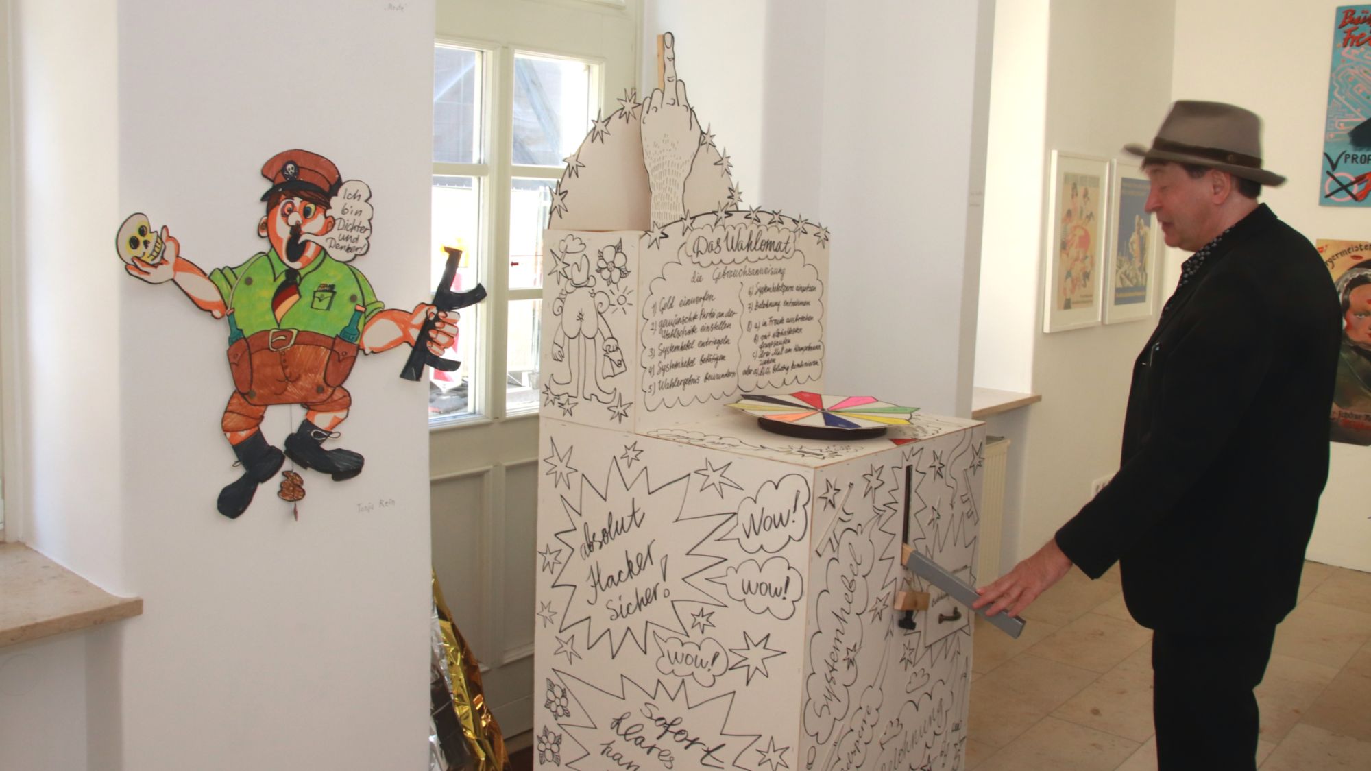 Und der Name? „Als Schauhase werden im Erzgebirge die größten Selbstdarsteller bezeichnet“, erklärt er den Zusammenhang zur Wahlwerbung. Als dann der Name stand, ergaben sich plötzlich ganz viele Werke, in denen auch Hasen vorkommen. Der wohl schönste Hase ist ein kleines Blechspielzeug, der aber gar kein Bestandteil der Ausstellung ist, aber irgendwie dann doch in der Galerie rumsteht.