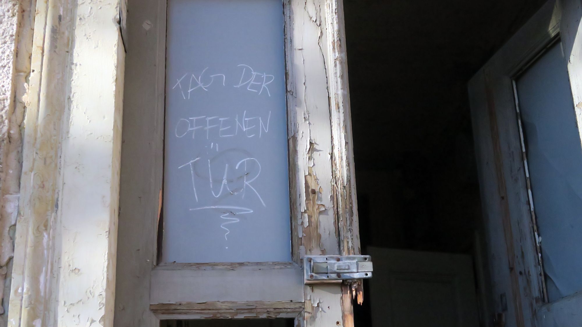 In eines der Gebäude kann man durch die Hintertür hineingehen. Der Zustand der einst wohl ziemlich schmucken Villa ist erbärmlich. Der jahrelange Leerstand hat Spuren hinterlassen. Das Dach ist an einer Stelle ziemlich durchgedrückt, dennoch von einsturzgefährdet wollen die Besetzer*innen nicht sprechen.