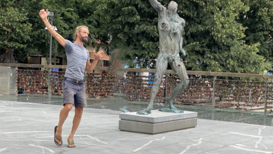 Und es packt ihn schon früh morgens: Wenn er seinen Sohn zur Schule bringt, checkt er an der Straßenbahn-Haltestelle schon einmal die Tageslage: „Dann fühle ich vor, was heute so geht, strecke schon mal einen Arm in die Luft, gehe danach in die Natur“ – und dann tanzt er. Tanzt sich frei von Emotionen, oft zwei Stunden am Tag. Die Bewegungen passt er an seine innere Verfassung an: „Je nachdem, ob ich gerade mental schräg oder gerade stehe.“