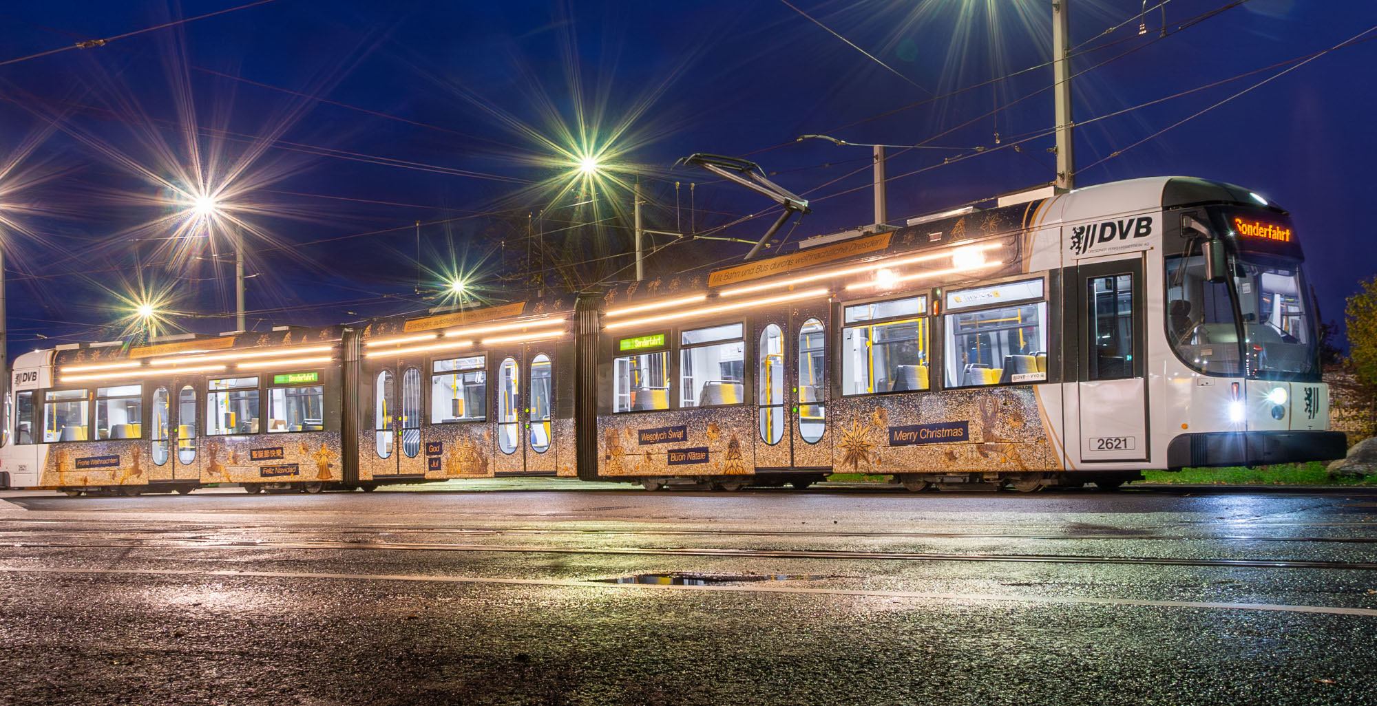 Eine besonders gestaltete und beleuchtete „Weihnachtsstraßenbahn“ ist jetzt im Schienennetz der Dresdner Verkehrsbetriebe (DVB) unterwegs. Bis zum Jahresende wirbt sie für den Besuch der Dresdner Weihnachtsmärkte, die Benutzung des ÖPNV und wünscht per mehrsprachigem Aufdruck allen Passagieren und Innenstadtbesuchern frohe Weihnachten.