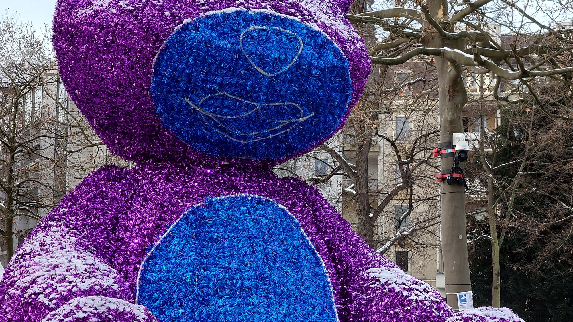 Im Sinne der sogenannten Panoramafreiheit dürfen Sie ohne Erlaubnis Bilder von Skulpturen, Brunnen, Passagen, Gebäuden, Atrien, Denkmälern, Reliefwandbildern oder beispielsweise Hausdurchgängen im öffentlichen Raum knipsen und veröffentlichen… da ist die Ausnahme vom Verbot. In unserem Fall war die Kamera klar auf den Teddy ausgerichtet.