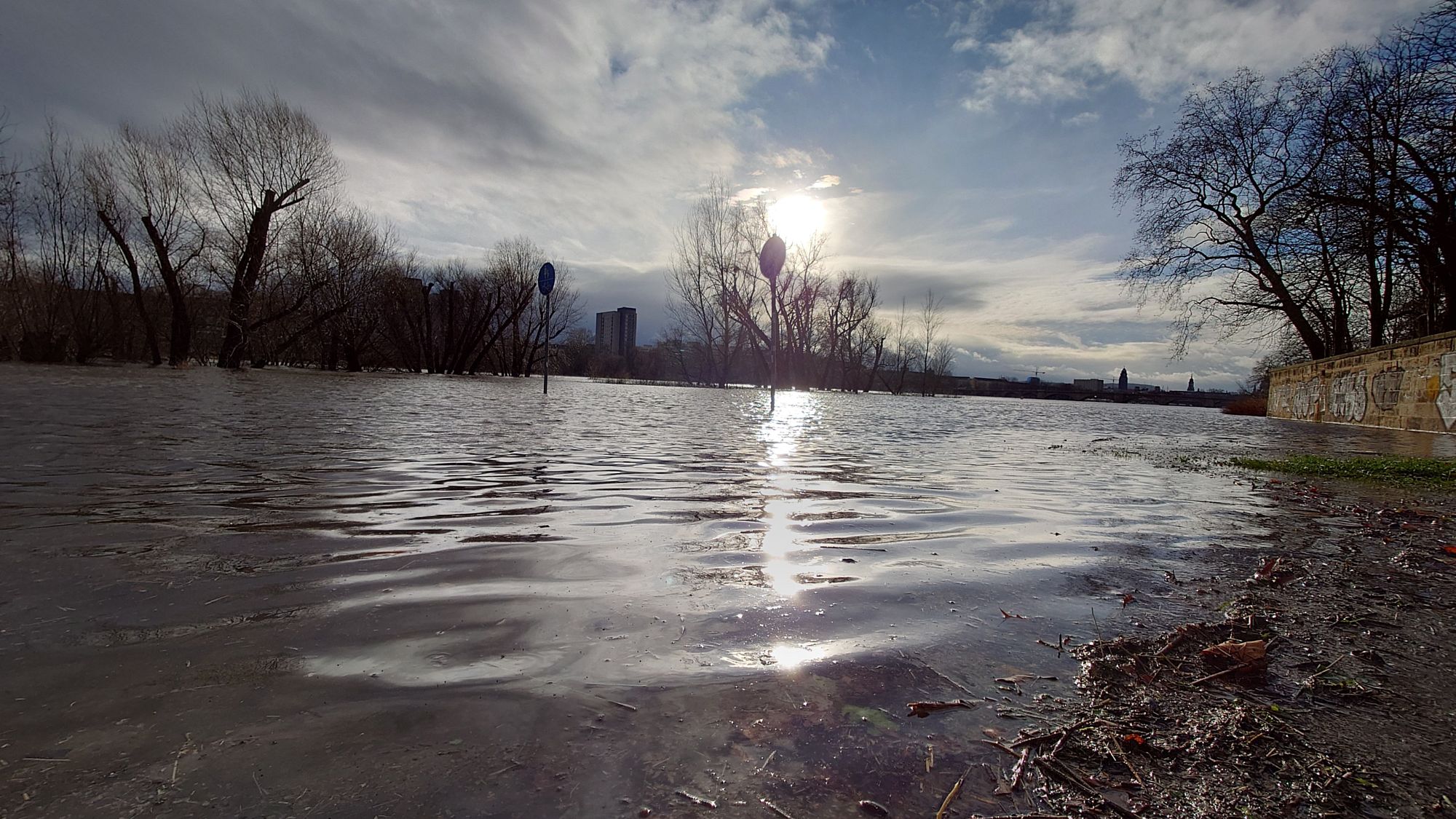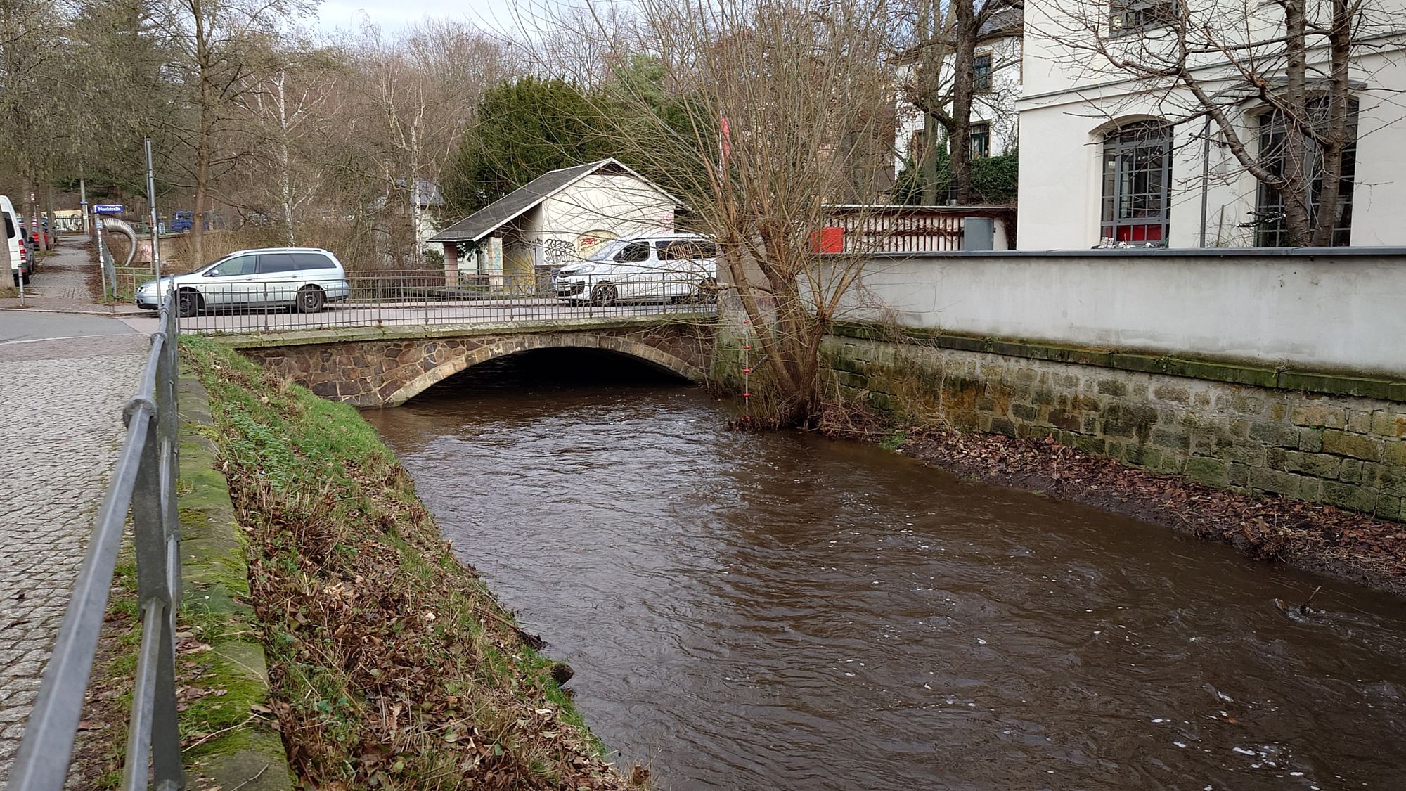 Schließlich staut sich auch die Prießnitz zurück, ist aber aktuell noch weit davon entfernt, an der Prießnitzstraße über das Ufer zu treten.