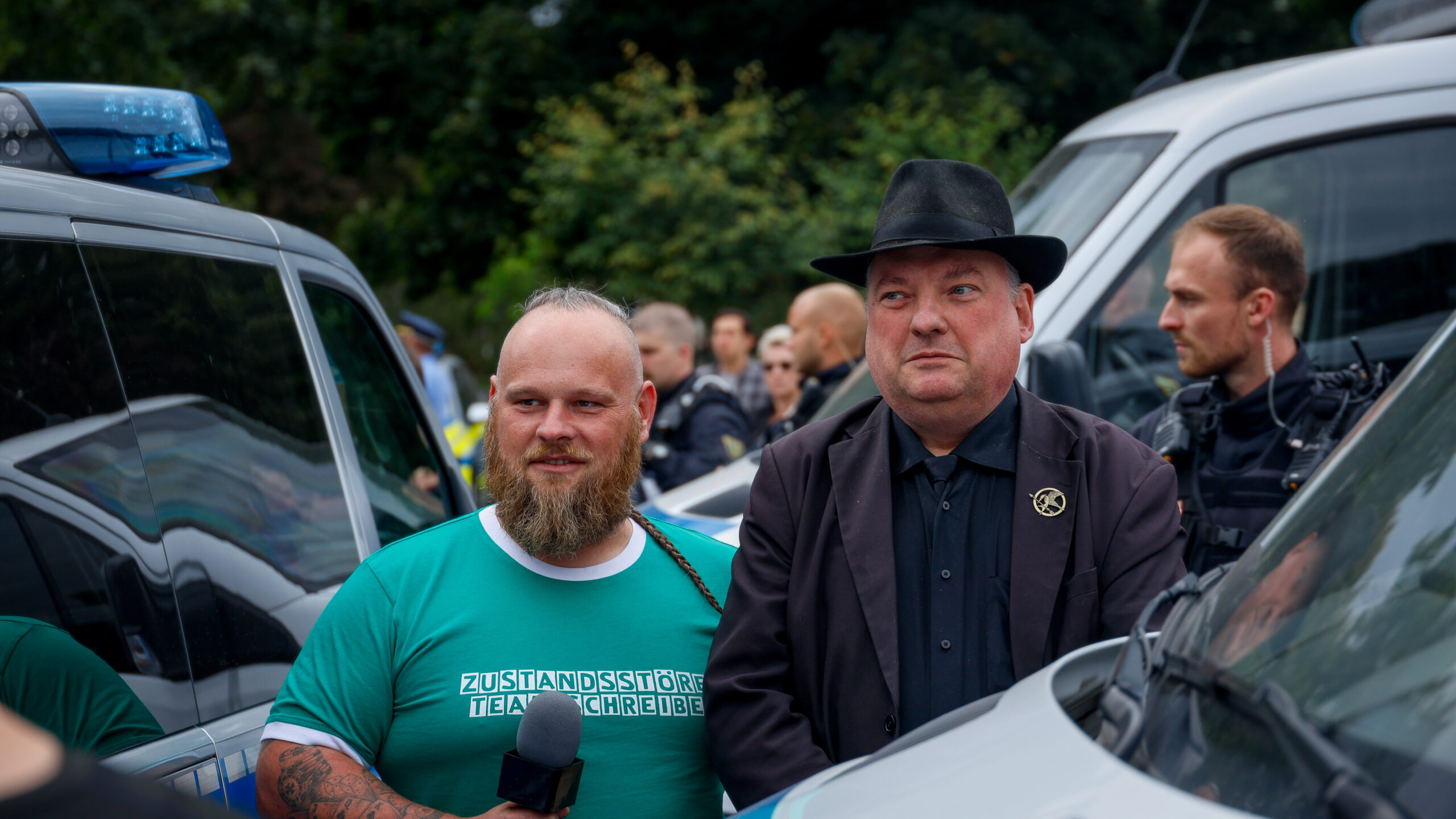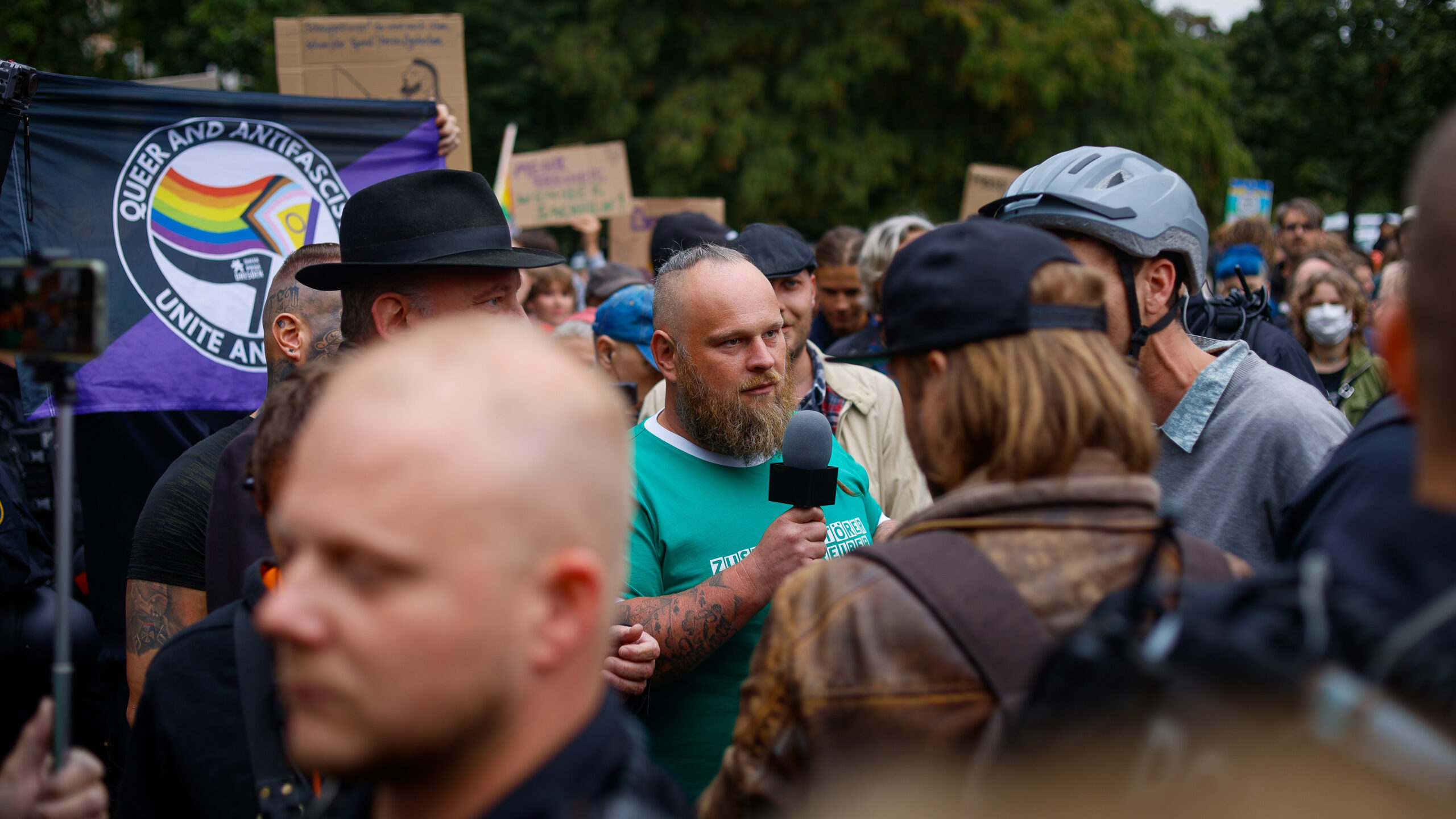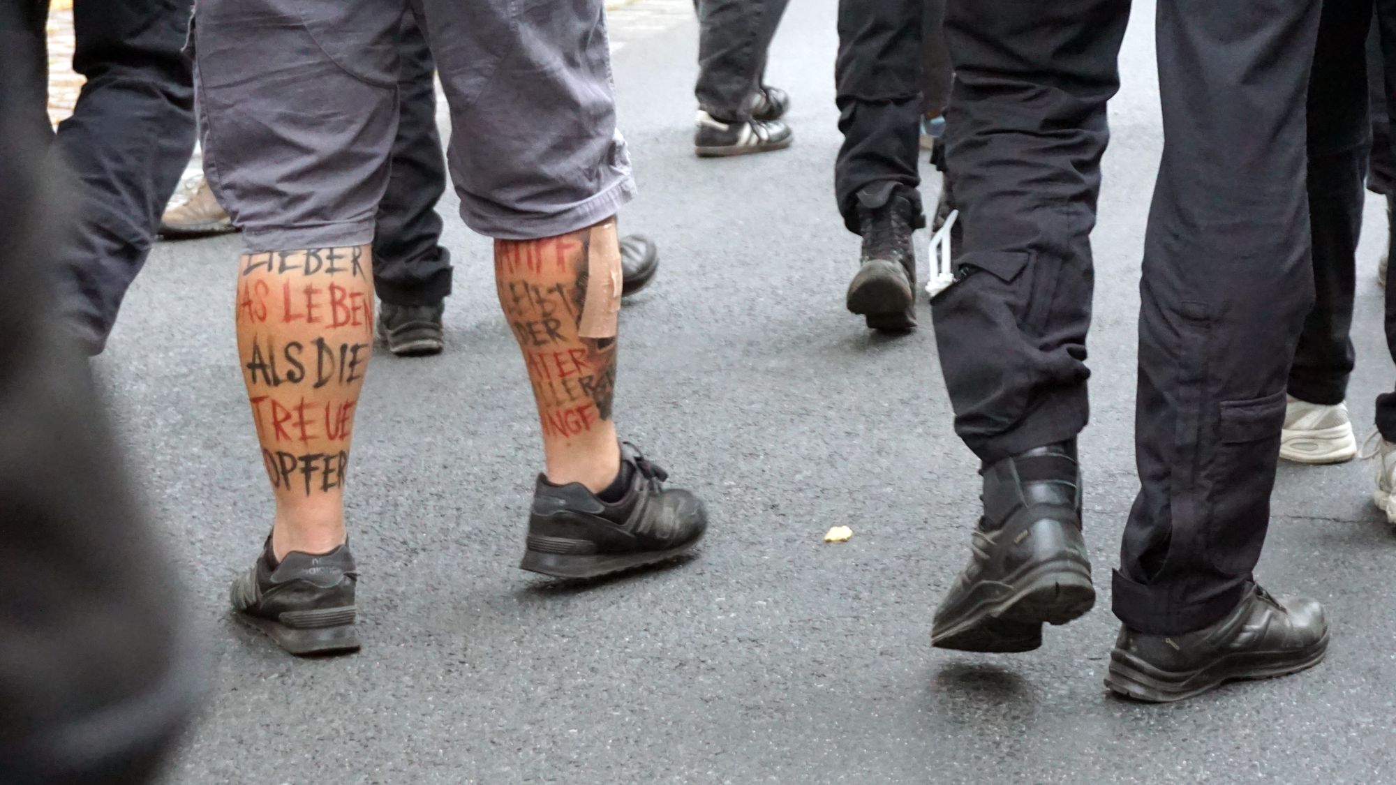 Gegen irdische Mächte konnte er jedoch nichts ausrichten – Schreiber bekam auch diesmal aufgrund seines verfassungsfeindlichen Tattoos eine Anzeige und wurde später von der Polizei, die mit insgesamt 63 Einsatzkräften vor Ort war, des Platzes verwiesen. Viele Gespräche zu führen, hat der Neonazi ohnehin nicht geschafft, war er doch umstanden von einem Pulk aus Polizist*innen und akustisch behindert durch Sprechchöre.