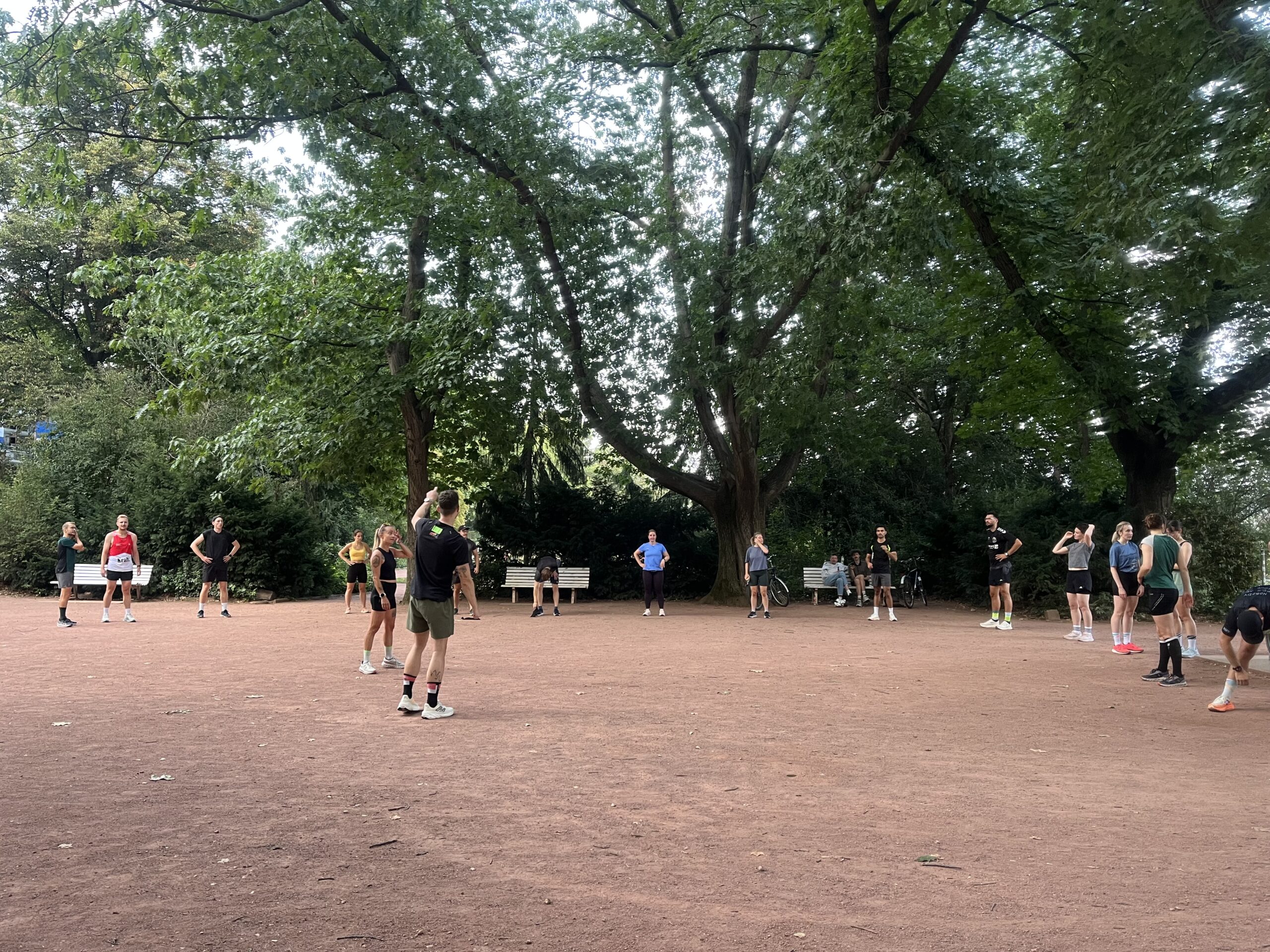 Im Rosengarten angekommen, heißt es erstmal: Aufwärmen. Ohne ein Wort zu sagen, bildet sich routinemäßig ein Kreis. Zwischen Steffen Bachmanns Skulptur „ani:mal“ und schwülen 25 Grad beugen sich alle nach vorn, greifen die Zehen, lockern Schultern und Hüfte. Erik und Sandra geben die Übungen vor, mal mit Zuruf, mal mit bloßem Vorzeigen. Beim konzentrierten Mitmachen verstummen langsam die letzten Gespräche, bis die Gruppe bereit ist für das Intervallprogramm.