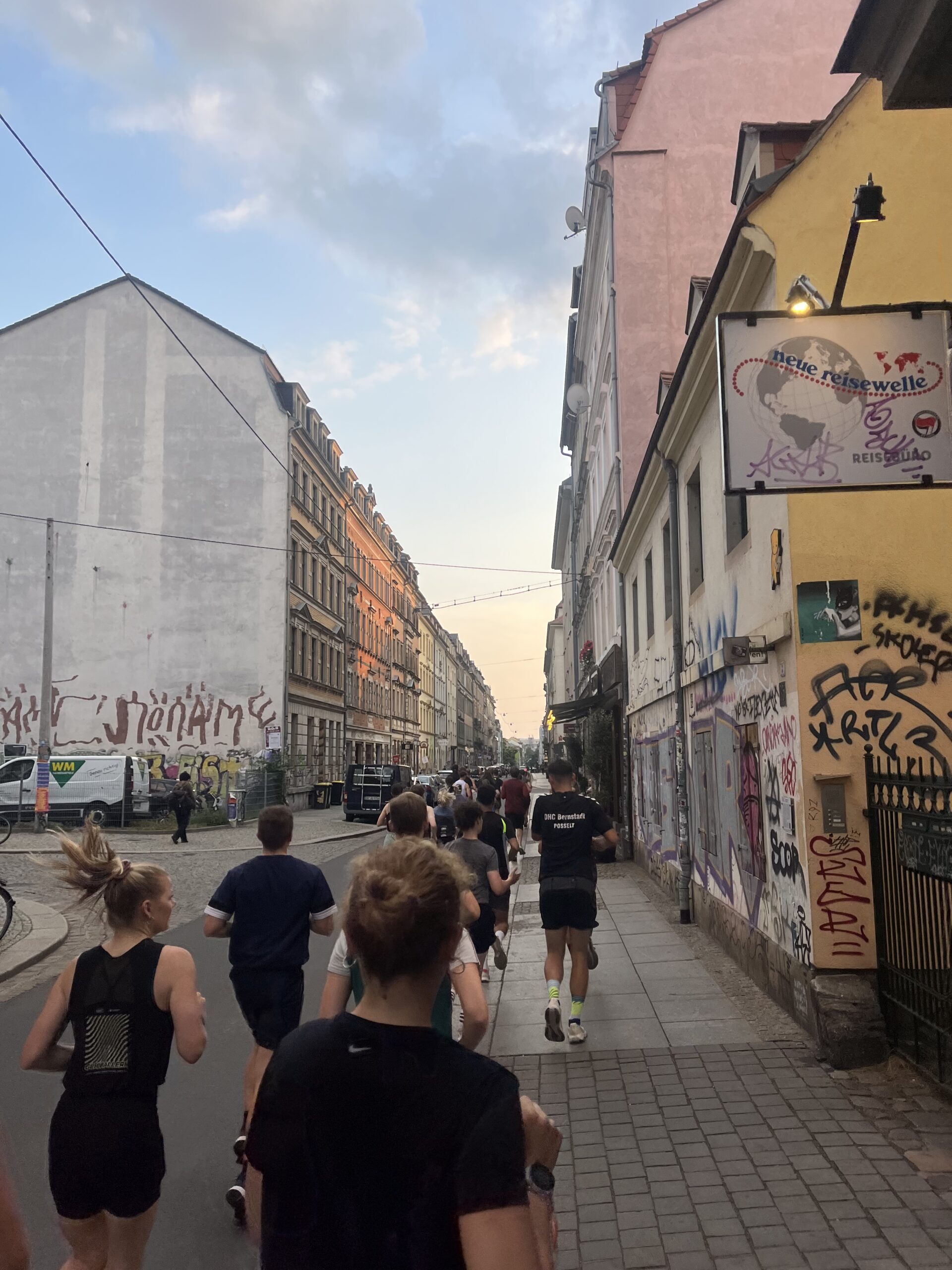 Es ist 19 Uhr. Die letzten Läufer*innen verstauen ihre Taschen im Späti, ehe Maria und Erik, die Ambassadors der Gruppe und damit die Gesichter sowie Organisator:innen der Dresdner Crew, die Gespräche unterbrechen, um alle zu begrüßen. Wie jede Woche fragen sie, ob jemand zum ersten Mal dabei ist, und verkünden anschließend das heutige Programm sowie das Ziel. Ehe das Ziel ausgesprochen wurde, ziehen die ersten schon Richtung Alaunstraße los, um bei sommerlichem Wetter in den Rosengarten zu laufen.