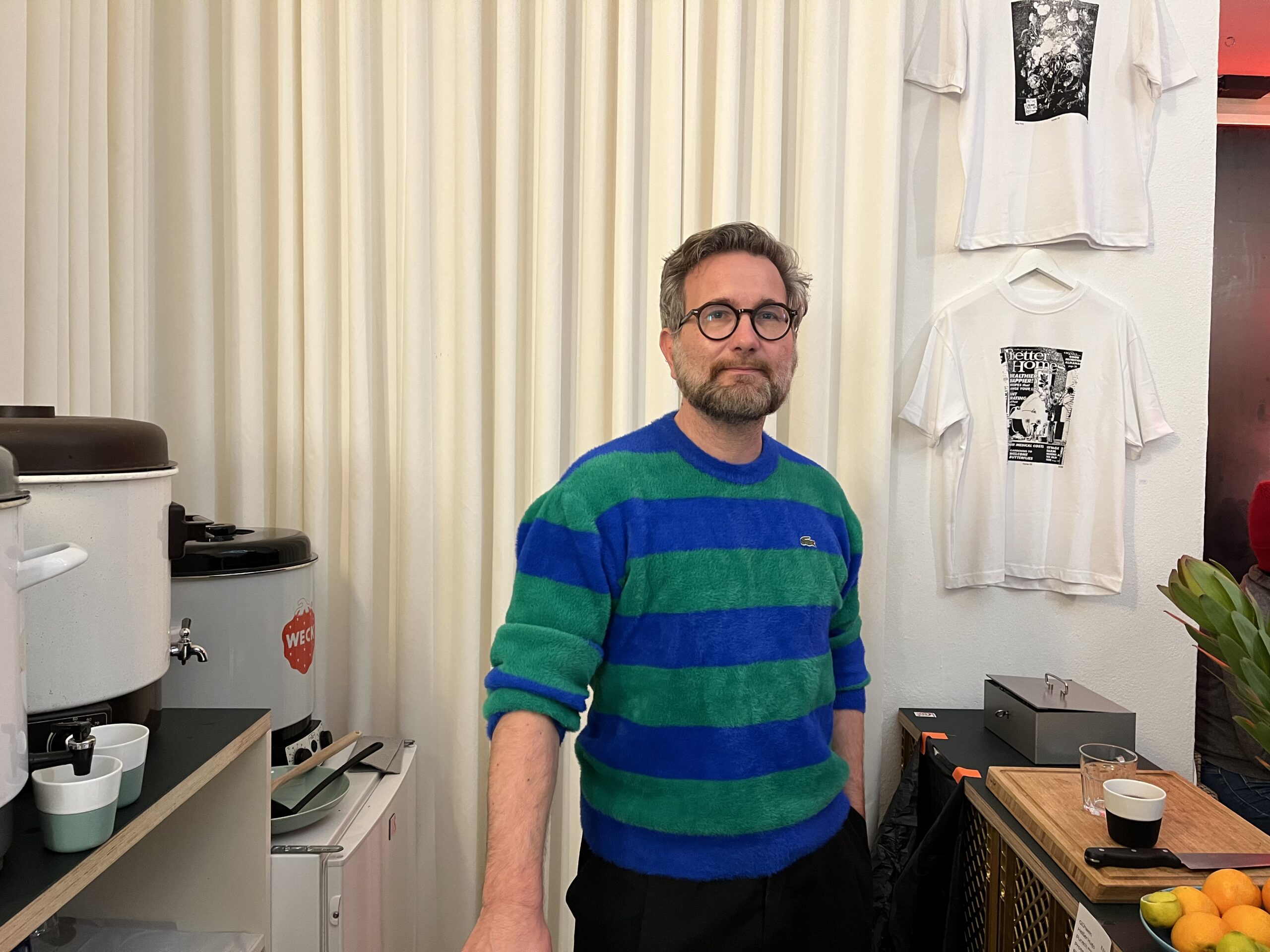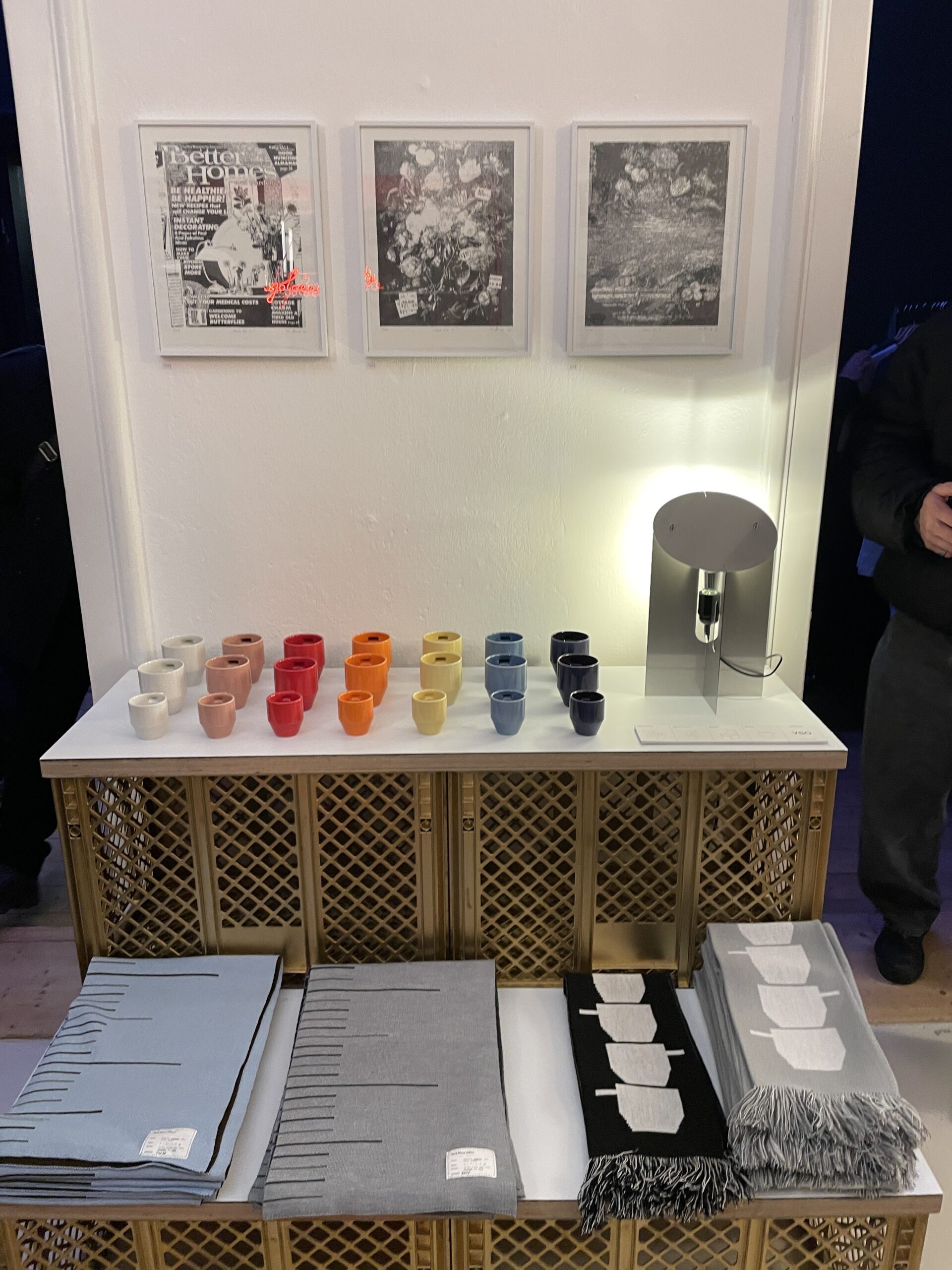 Während ich zwischen Menschen und Designobjekten schwankte, kam man kaum an der Theke mit Mathias Kühne vorbei, Designer und Co-Founder des Designbüros pingundpong. Kühne erzählte, wie eng die gemeinsame Arbeit mit YSO und Künstler Tony Franz verzahnt ist: „Wir haben die Kunstwerke von Toni auf Schals gebracht und sie als Siebdruck auf Shirts gebracht“, erklärte er. Die Zusammenarbeit sei fast selbstverständlich entstanden – Ole habe im vergangen Jahr bei pingundpong ein Praktikum gemacht, in diesem Jahr sei dessen Freundin im Team. „Das bot sich einfach an“, sagte Kühne und verwies auf die goldene Pforte, die seit Jahren als Galerie diente und sich zunehmend für Design und Pop-Up-Formate öffnet.