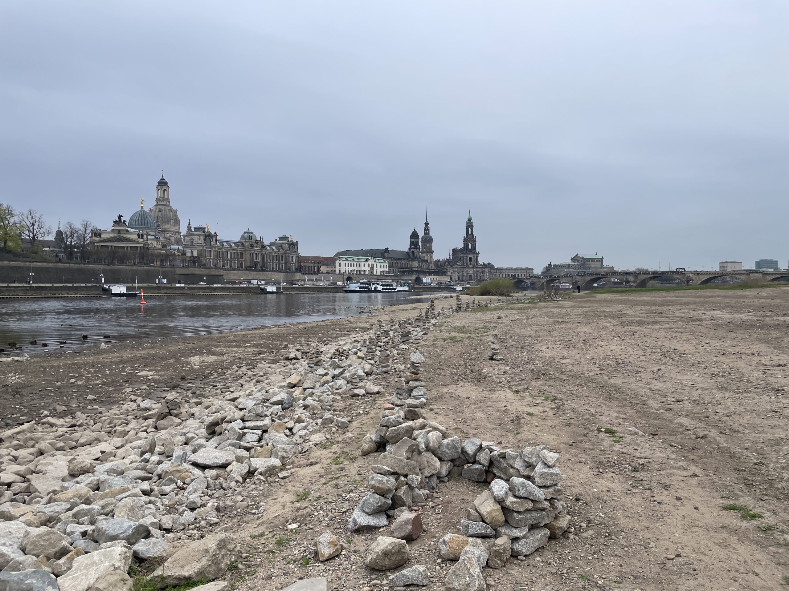 Wer in den letzten Tagen aufmerksam am Elbufer auf Höhe der ehemaligen Carolabrücke unterwegs war, dem sind sie vermutlich schon aufgefallen: zahlreiche Steinstapel, auch Steinmännchen genannt, aufgeschichtet aus Steinen und dem Geröll der mittlerweile längst verschwundenen Brücke. Die Türme ziehen sich in auffälliger Länge und in unterschiedlichen Größen über die durch den Abriss der Carolabrücke entstandene, bislang noch karge Uferlandschaft.