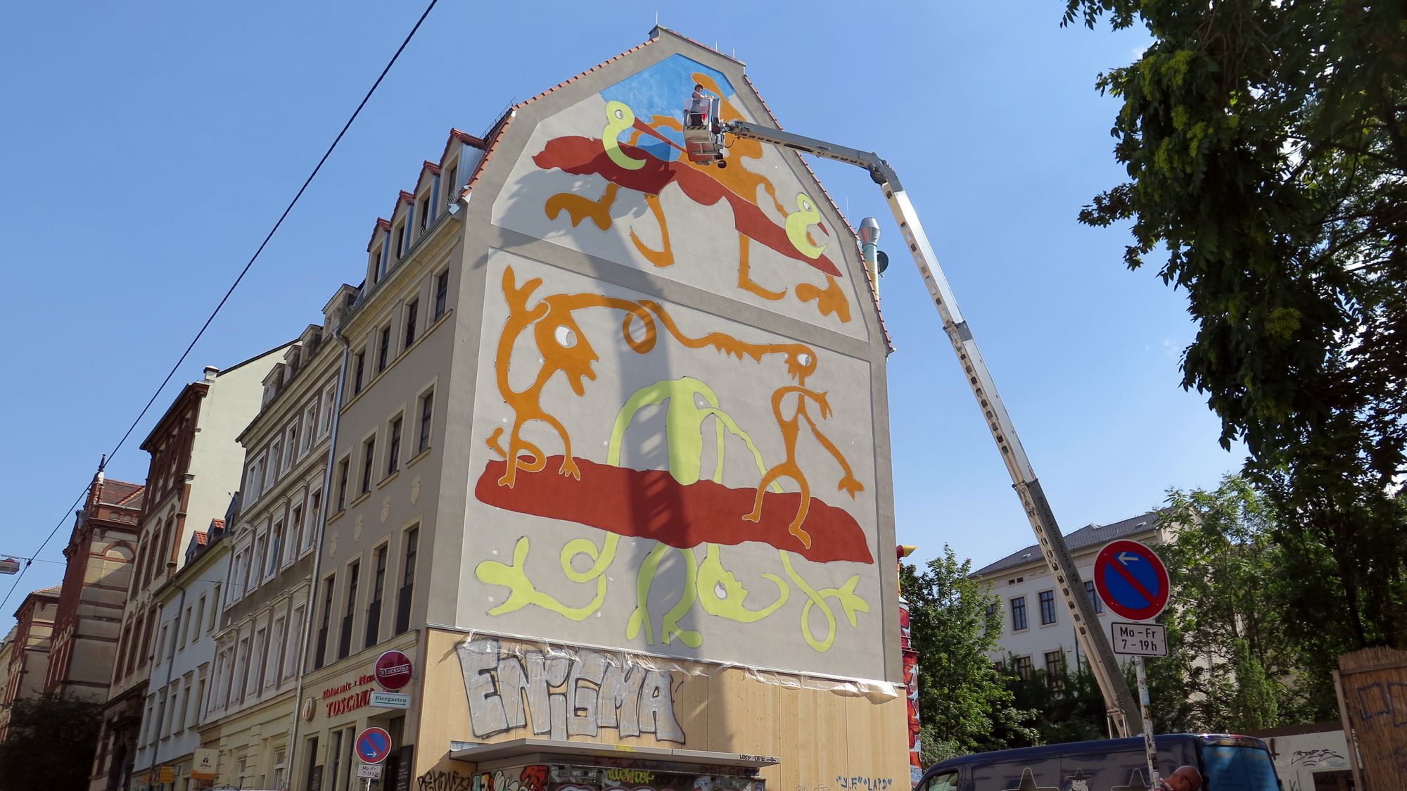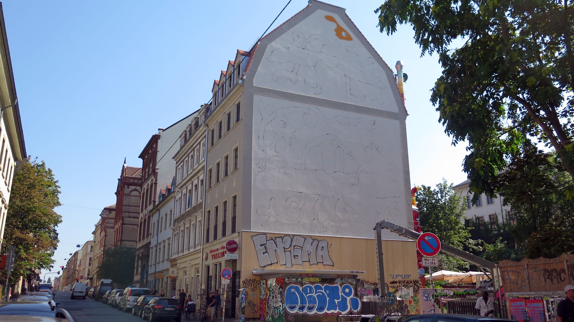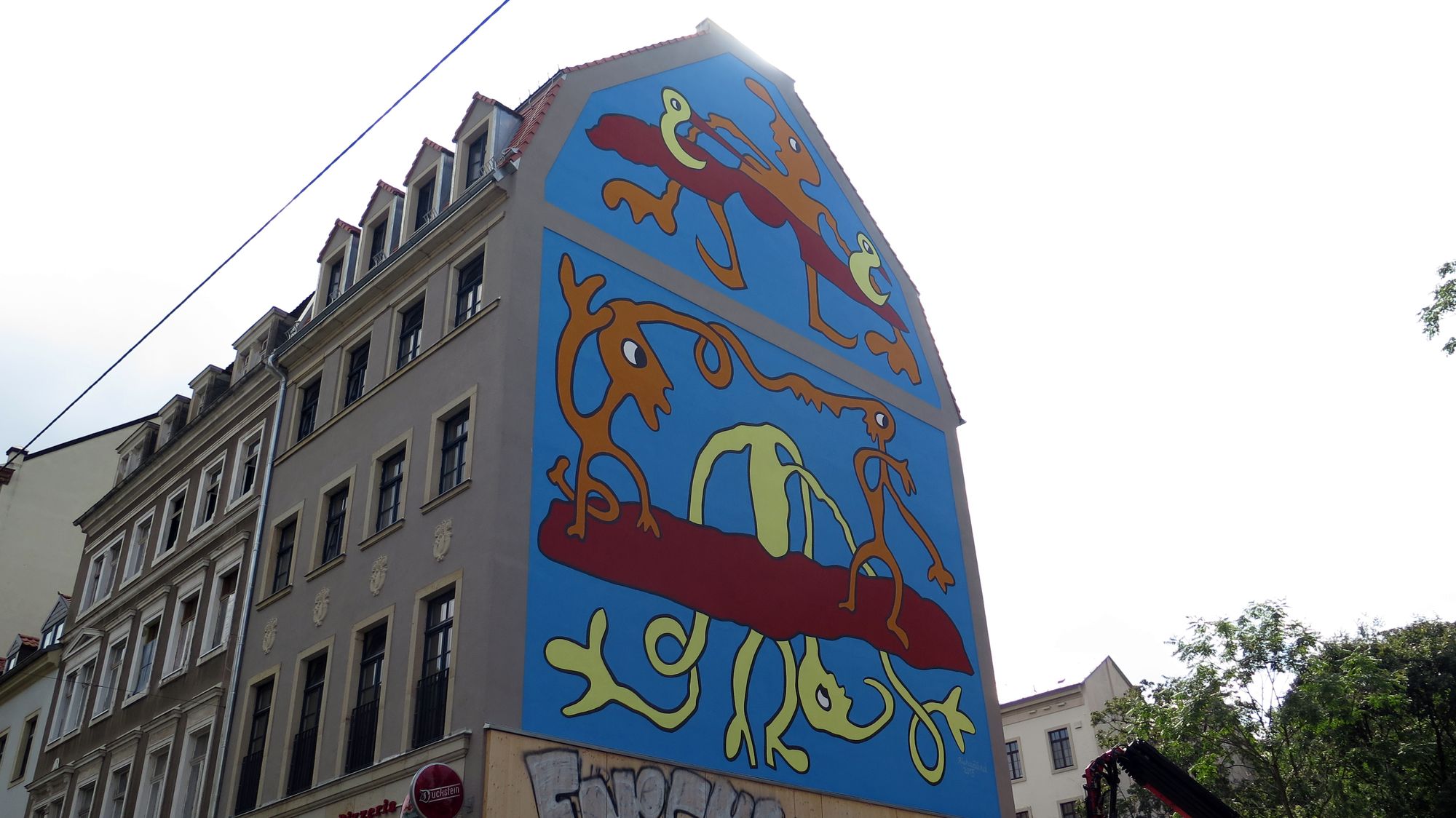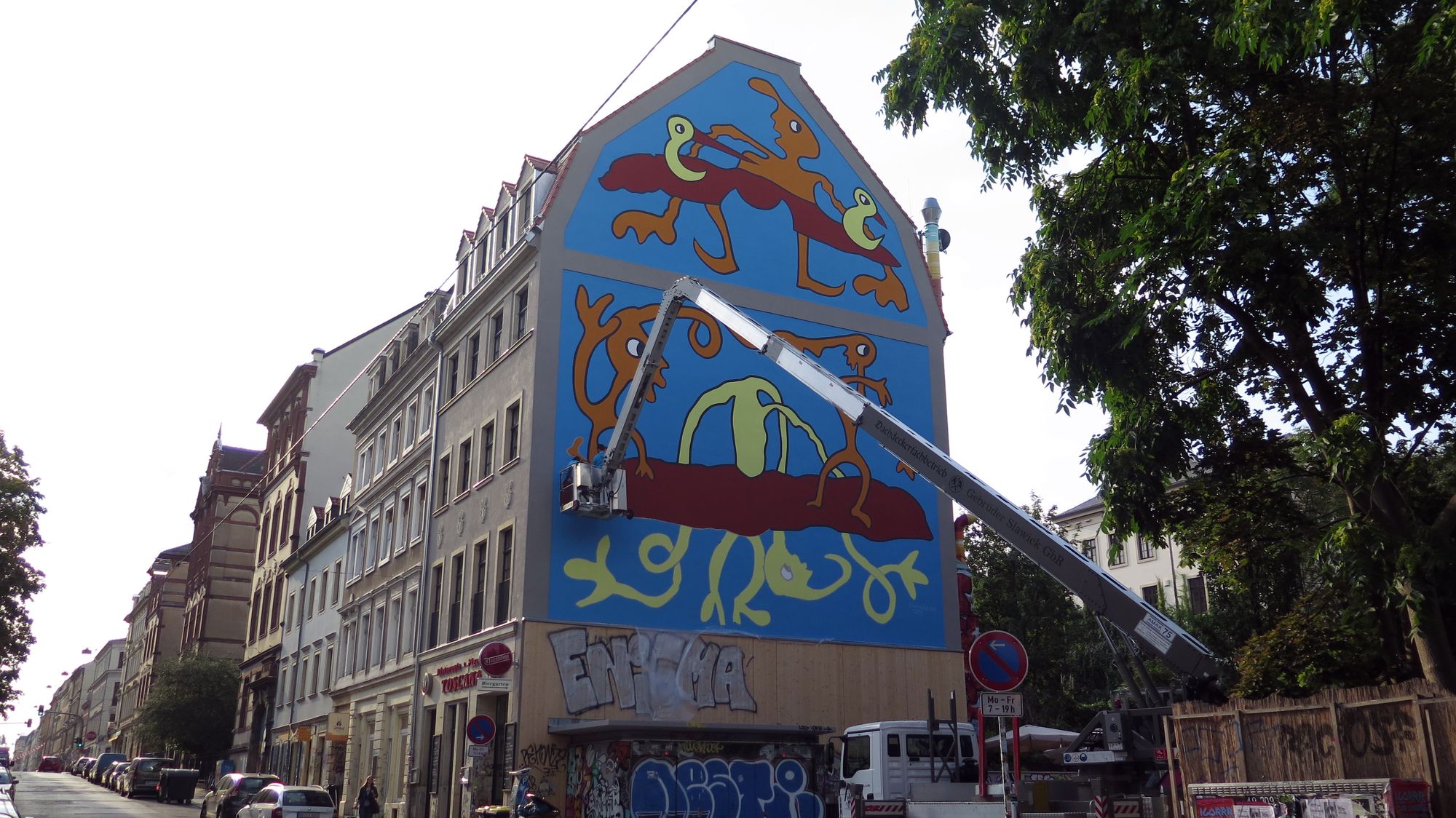 Früher war der Schriftzug im ganzen Bild versteckt: RichaâârdRichaâârd hatte die Skizze vorgegeben und die Maler Anja Tomaschewski und Andy Domigall füllten die Fläche mit Farbe. Jetzt leuchtet das Haus prächtig in der Sonne. Zum Bild sagt der Künstler: „Die Straßen der Dresdner Neustadt sind in wirklichem Sinn Lebensraum, man könnte sie mit einem Wohnzimmer vergleichen.“ Und über dem Sofa im Wohnzimmer wolle er gern ein etwas fröhliches sehen, etwas „zum Kichern“. Den unteren Bereich, den einst die Schriftzüge „ASiA“ und „jEFF“ zierte, hat er wieder frei gelassen. Dort wollen in naher Zukunft Dresdner Graffiti-Künstler den alten Schriftzug in neuer Form aufleben lassen. „Sie haben mich sogar nach den Nummern meiner Farben gefragt“, berichtet Richaâârd.