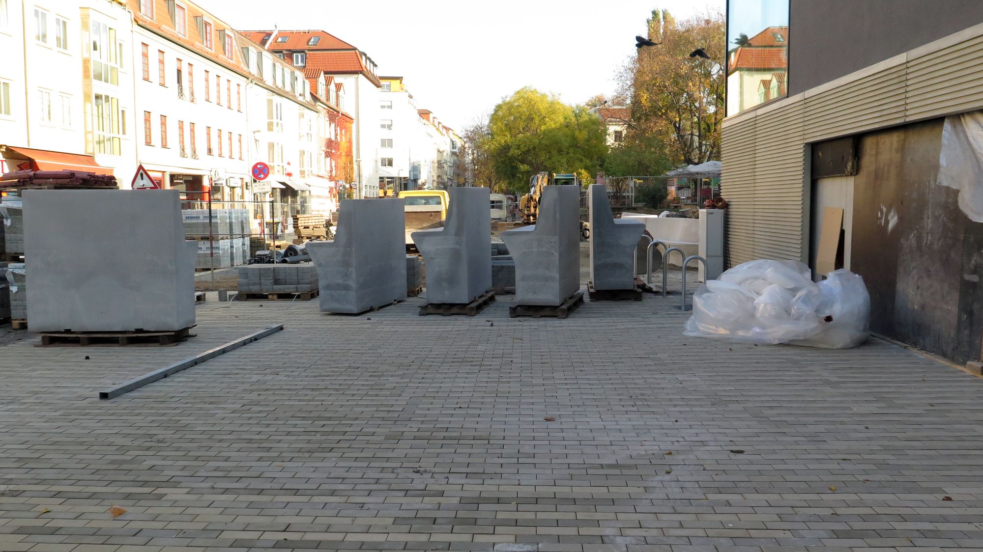 Vorm Turnhallen-Eingang stehen Beton-Klaviere rum. Zumindest sehen die Bauteile von der Seite fast so aus. In dem Bereich zwischen Turnhalle und Treppe steht die neue Mauer, fast komplett. Sehr gut kann man jetzt erkennen, wie groß der Scheunegarten künftig wird. Dieser Bereich, so erläutert Undine Neubert, die Projektleiterin von der Stesad, soll bis zur Vorweihnachtszeit fertig sein. Schon in gut zwei Wochen wird aber erstmal die Tiefgarage unter der Turnhalle frei gegeben. Der Platz davor ist fertig gepflastert.