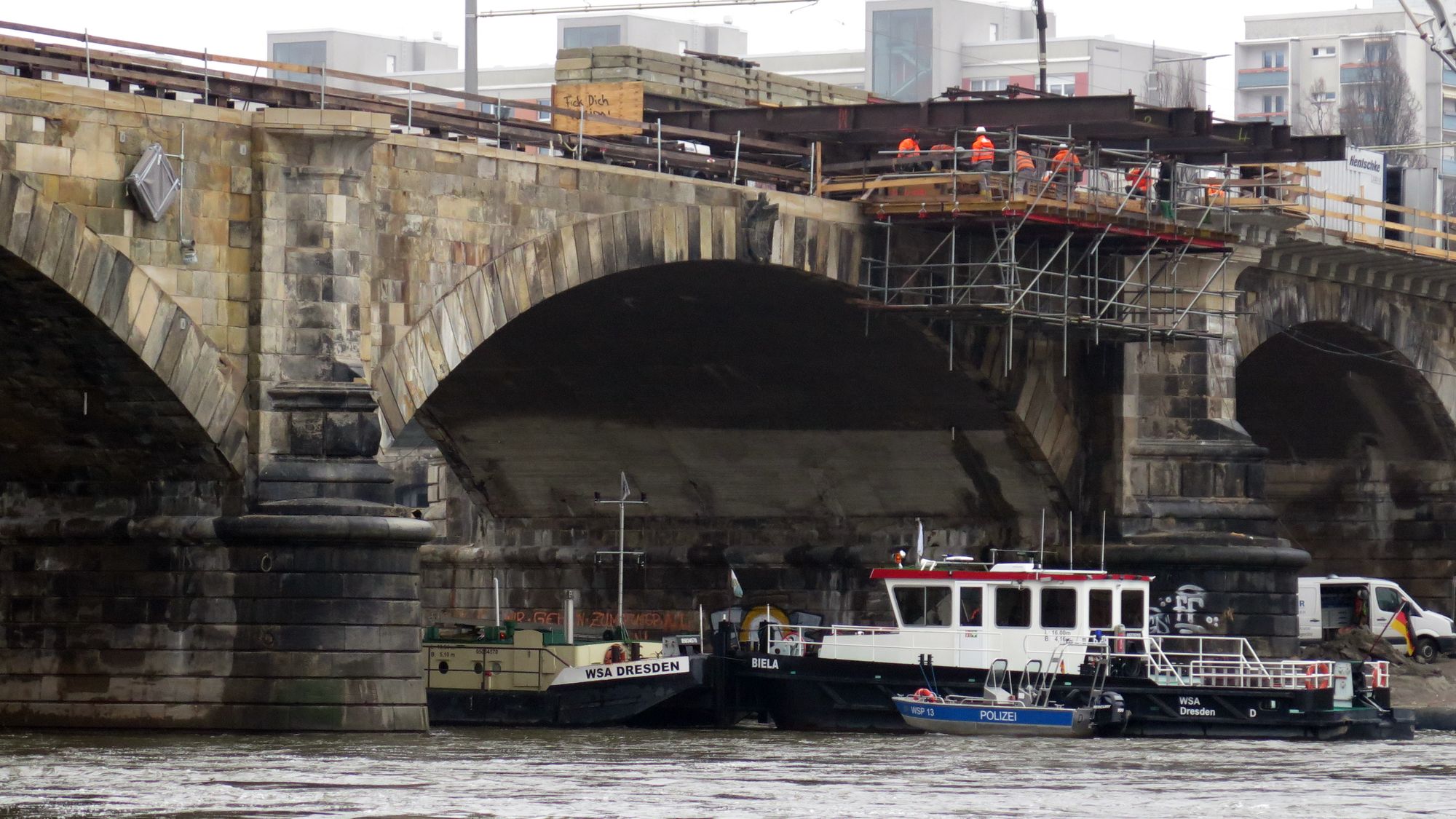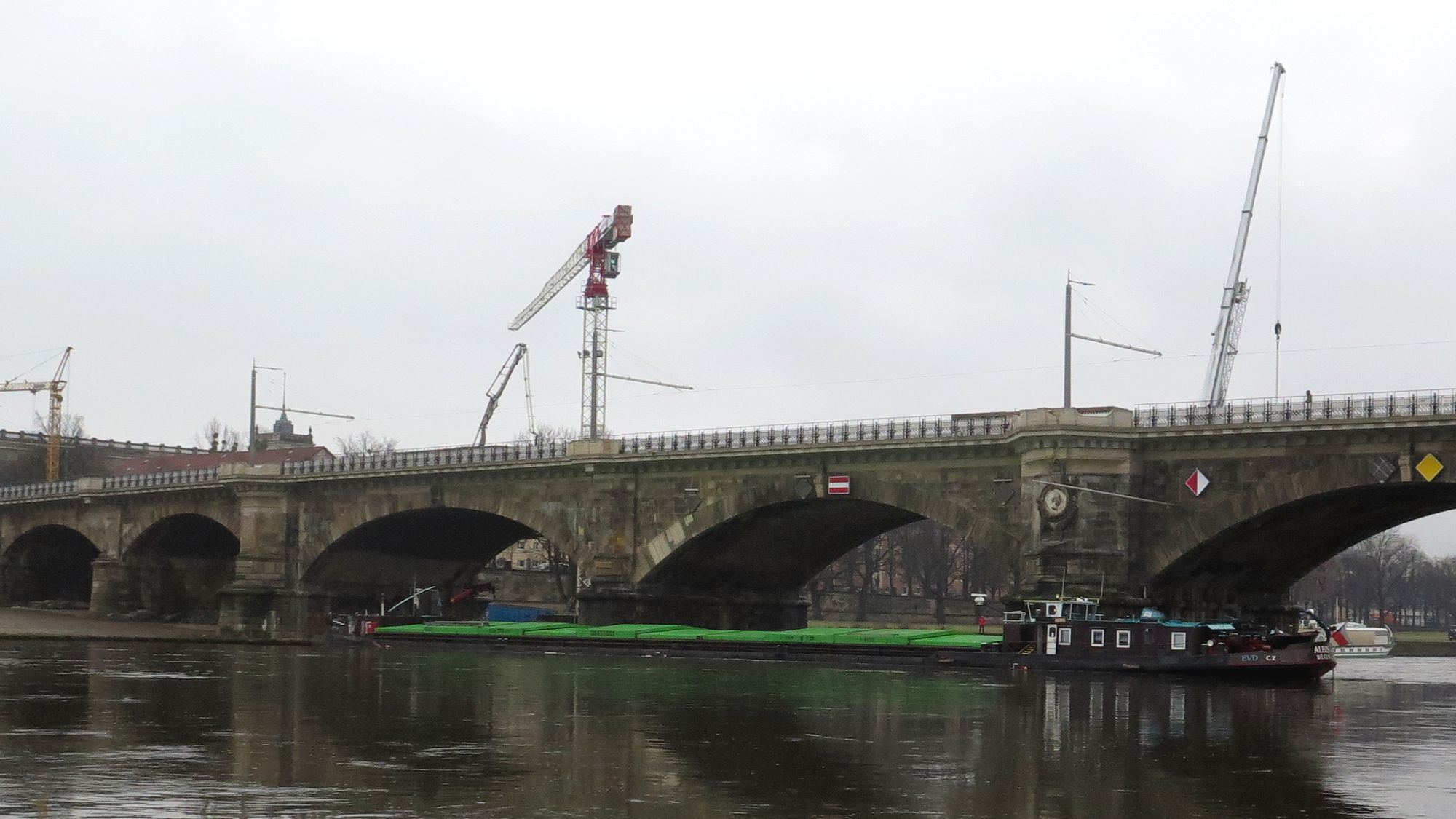 Eigentlich sollten ab heute die Schifffahrtsöffnungen an Albert- und Augustusbrücke geprüft werden. Dazu sollte ein Schubschiff mit Hebebühne unter die Bögen fahren. Daraus wird nun zumindest an der Albertbrücke vorerst nichts. Im Laufe des Vormittags trafen zwei weitere Schlepper an der Unfall-Stelle ein.