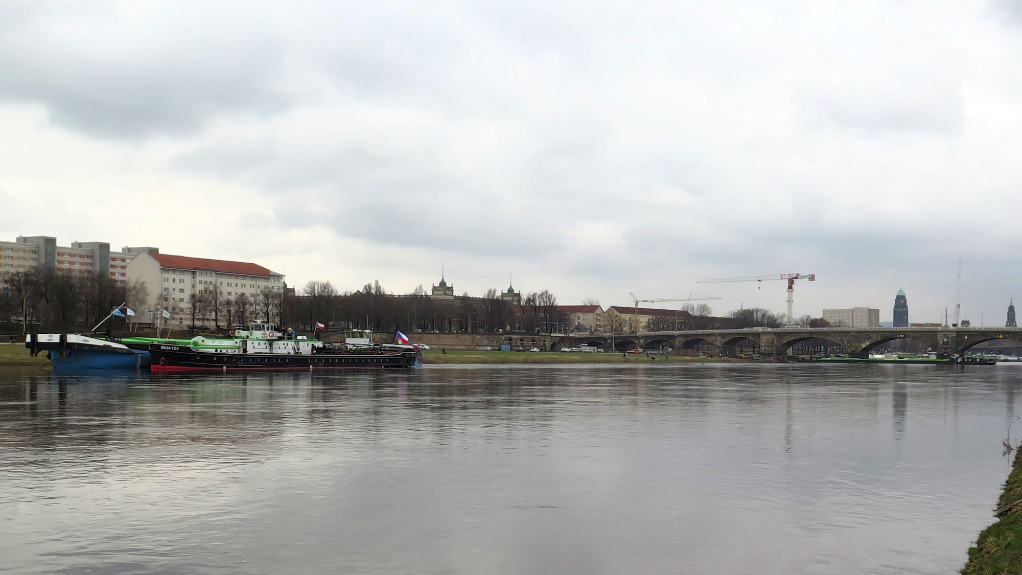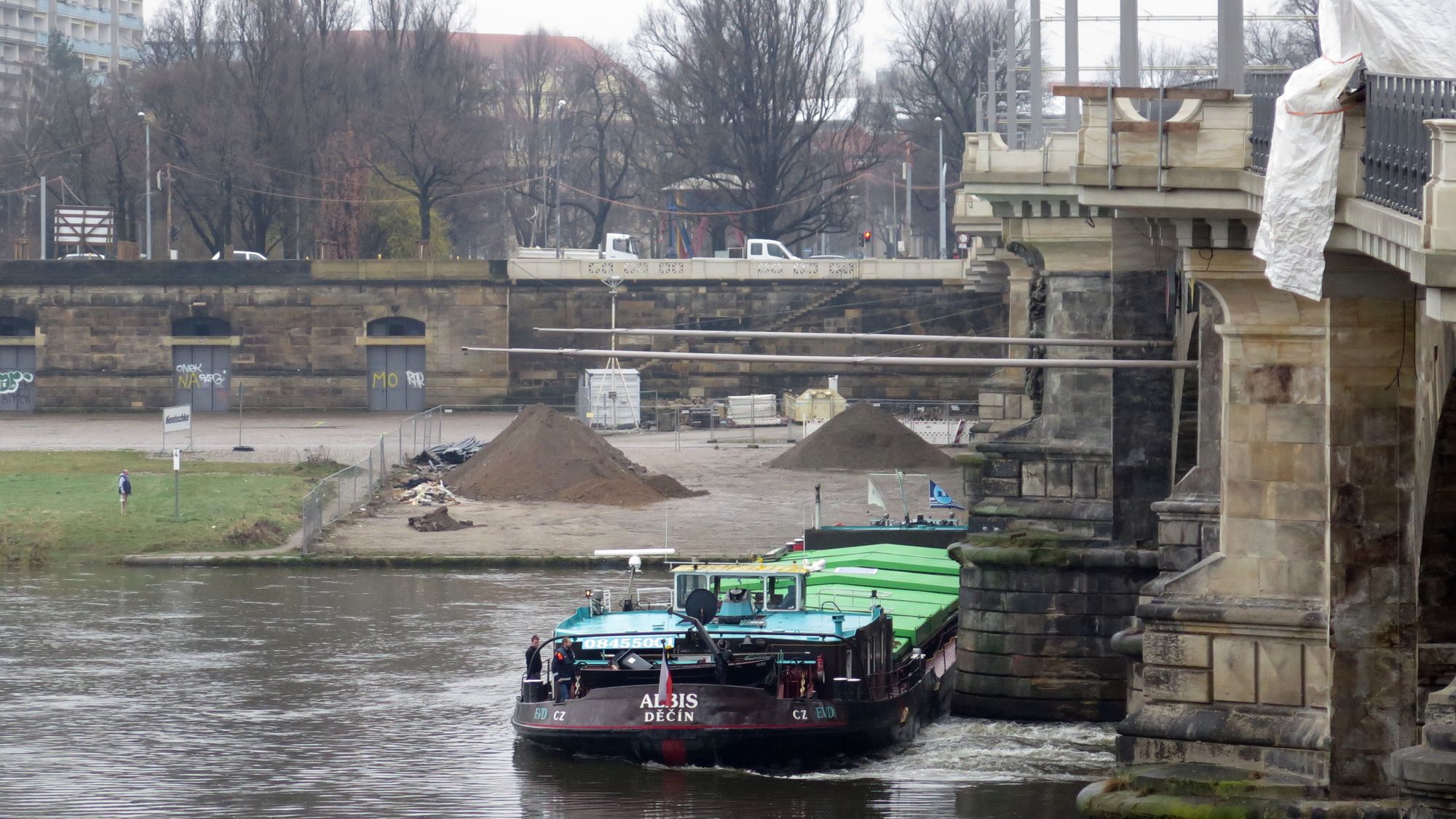 Vielleicht hängt das ja mit den neuen Geländern auf der Albertbrücke zusammen? Die laden ja zum dran Hochklettern ein. Also ist der Frachter vielleicht nur Fallschutz? Vorbeugende Maßnahme von Herrn Köttnitz?