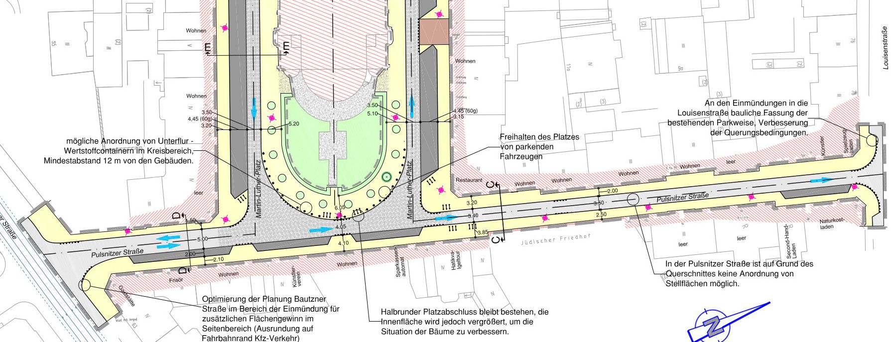 Nach den bisherigen Plänen bleiben die Fahrrichtungen erhalten. Also zwischen Martin-Luther-Platz und Bautzner Straße in beiden Richtungen. Zur Louisenstraße hin, wie bisher, Einbahnstraßen. In diesen Teilstücken sollen die Parkmöglichkeiten entfallen. Auf den beiden nördlichen Straßenteilen sollen insgesamt 45 Stellplätze wegfallen. Allerdings wird die derzeitige Schrägparksituation auf der südlichen Martin-Luther-Straße legalisiert, zwischen Fitness-Studio und Lloyds-Café. Ausbau der Martin-Luther-Straße erst 2017