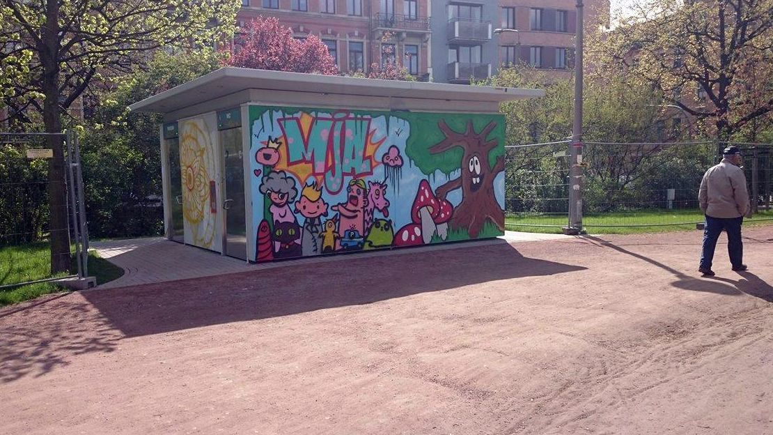 Als das moderne Luxus-Klo (250.000 Euro) noch eingezäunt und gar nicht fertig war, hatte ein Sprüher einen blassrosa Penis mit weißem Ejakulat auf die Wand gemalt. Daneben stand etwas schamhaft der Schriftzug Amor.