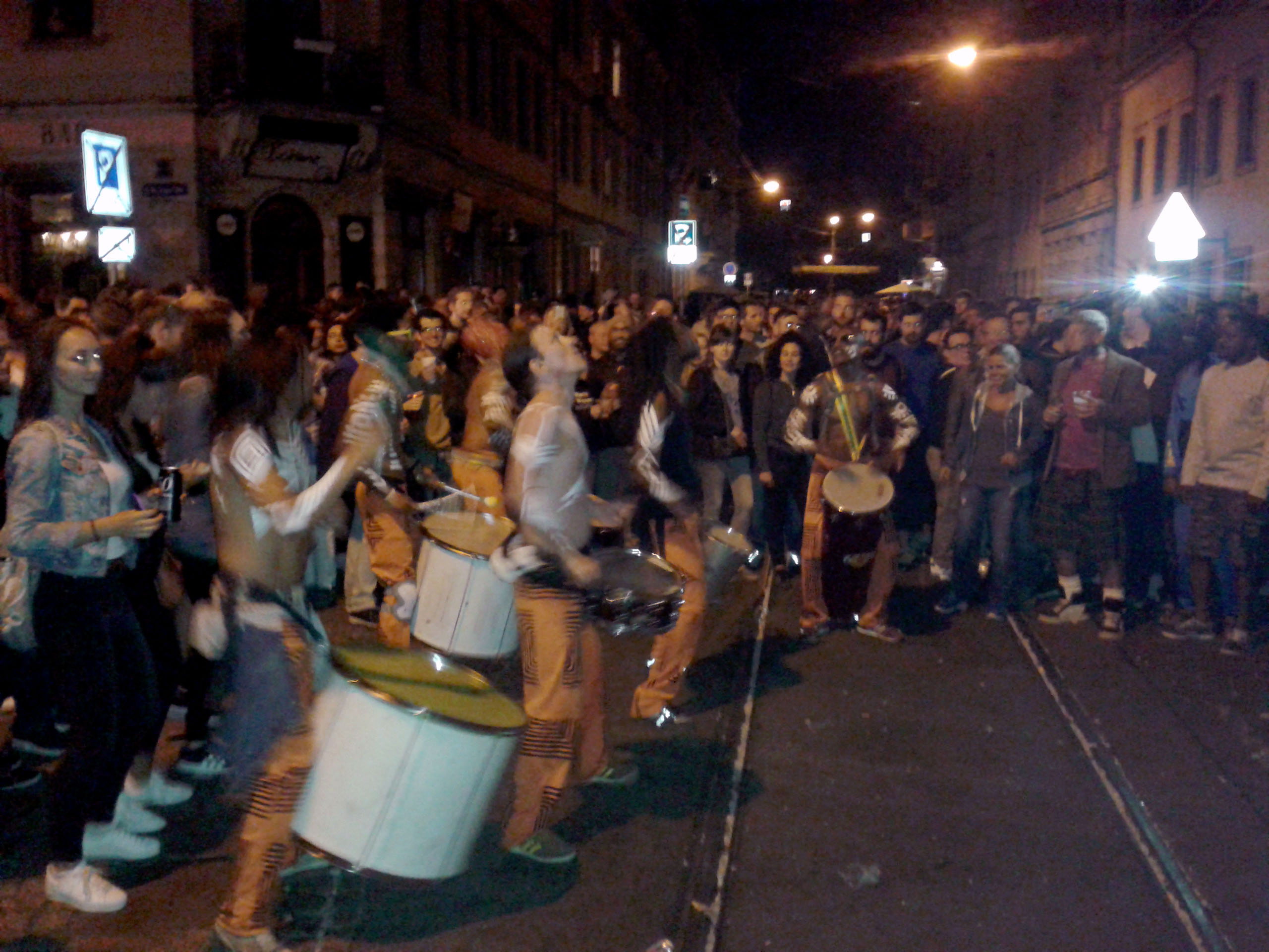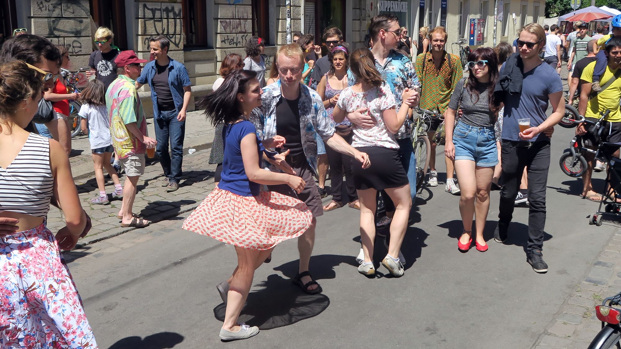 Dennoch war es insgesamt ein schönes Fest. Fast zu jeder Stunde kam man an Engstellen prima durch. Engagierte Anwohner konnte man mit witzigen Aktionen bestaunen, so man sie denn fand. Am Sonntag tafelte die halbe Neustadt wieder zum großen Gemeinschaftsfrühstück auf der Straße. Neben den vielen Rummel-Techno-Türmen gab es auch eine Menge interessanter Musik zu bestaunen. Tolle Shows gab es im Kukulida-Zelt, den Luther-Platz-Bühnen, zum Sonntags-Tanz vorm Laika und natürlich bei den Punkrockern auf dem Alaunplatz. Aufsehen erregte der brachiale Umzug der Samba-Universo-Trommler. Herrliche Publikumsaktion: Die Schokokuss-Maschine auf der Kamenzer Straße.
