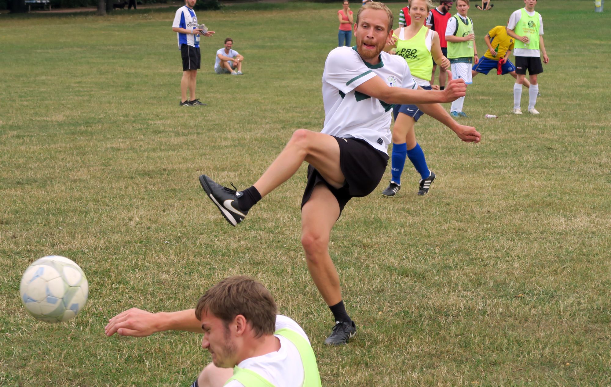 Die ersten Spiele startete um 11.11 Uhr. Teams mit so hippen Namen wie „DTDMPABG – das Team, dass mir persönlich am Besten gefällt“ oder einfach „Neuse“ oder „Rote Buchse Neustadt“ traten an, um in 10-Minuten-Runden Punkte zu sammeln. Mit Schiedsrichter, mit Handballtoren, mit (teilweise allerdings schlecht erkennbarer) Außenlinie, sogar Eck-Stangen waren da.