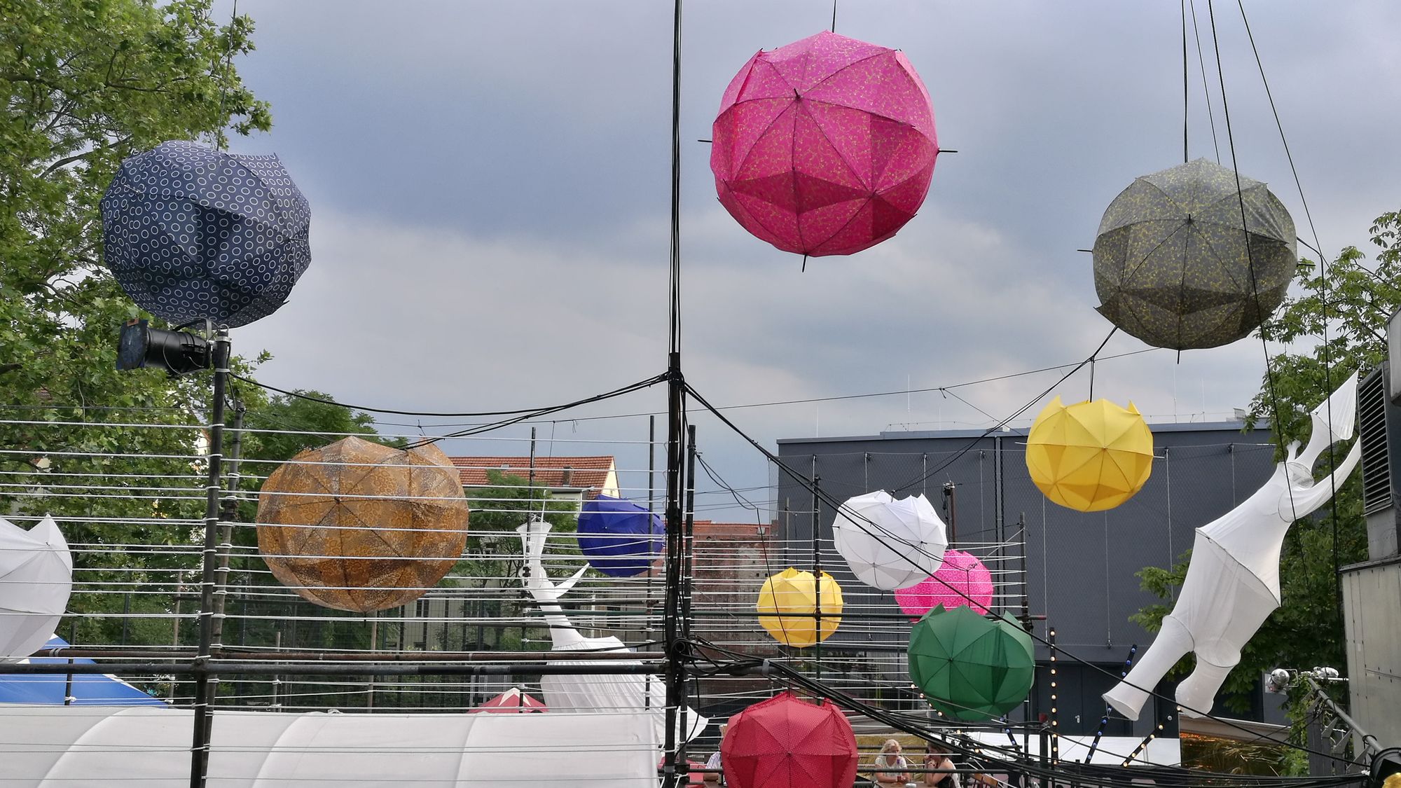 Großartig: Muttis KinderIm großen Scheune-Saal geht es los. Zwei Herren, eine Dame, ein Mikrofon. Ausdrucksstarke Mimik, zurückhaltende Gestik und toller Sound aus drei Mündern, Hörprobe hier. Begeistert taumle ich aus dem Saal, inzwischen ist es dunkel. Die Regenschirm-Deko leuchtet eindrucksvoll im Nachthimmel, ein Absacker und der erste Buden-Abend ist Geschichte.