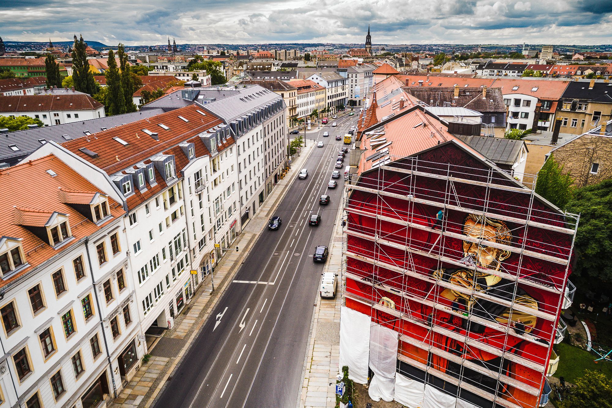 An der Bautzner Straße, Ecke Pulsnitzer, ist seit dem Wochenende ein riesige, knallrote Fassadengestaltung zu sehen. Ziemlich prominent wirbt ein Bierbrauer aus der Region auf dem Bild.