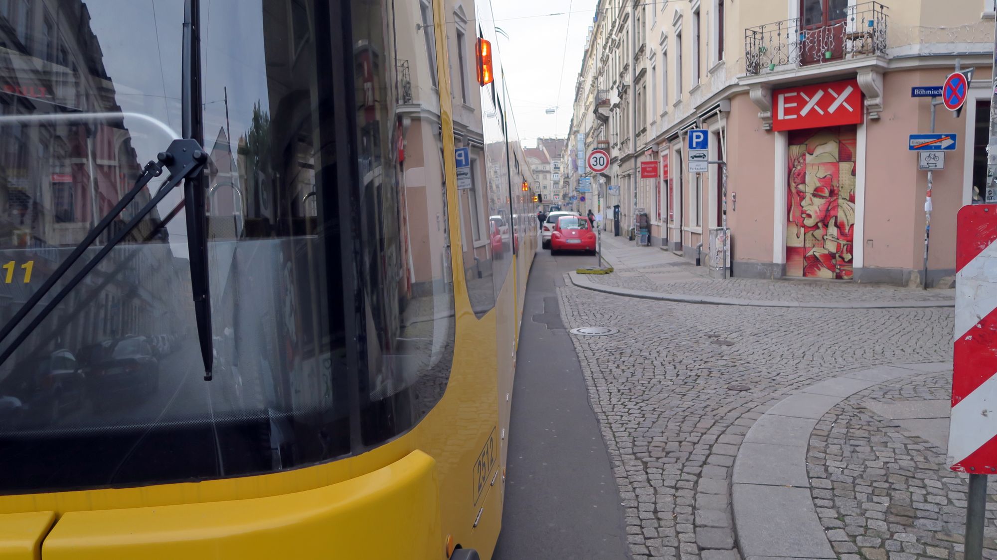 Als dann die zweite Bimmel angerauscht kam, der DVB-Dispatcher um die Ecke bog und sich eine kleine Autofahrerwartegemeinschaft bildet, taucht gewissermaßen aus dem Nichts eine junge Frau auf, sich schwang sich flink in ihr Gefährt und löste das Knäuel auf.