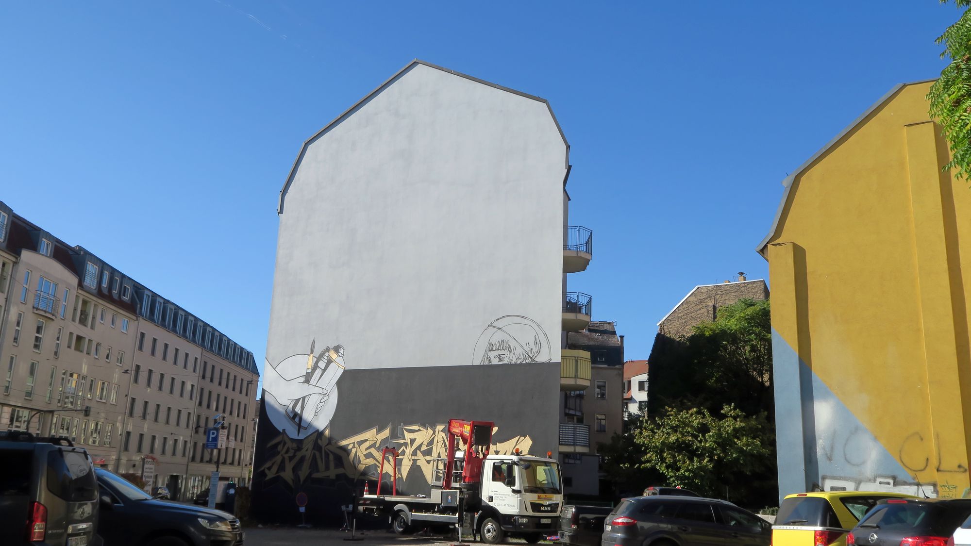 Mitte September war hier ein Wandbild nach Entwürfen des Neustädter Siebdruckers und Grafikers Lars P. Krause entstanden. Es war von Anfang an als temporäres Projekt geplant. Auf den hellen Grundton wird nun ab Sonnabend ein neues Wandbild der „Bandits Dresden“ aufgetragen, dass diesmal keinen kommerziellen Hintergrund haben soll.