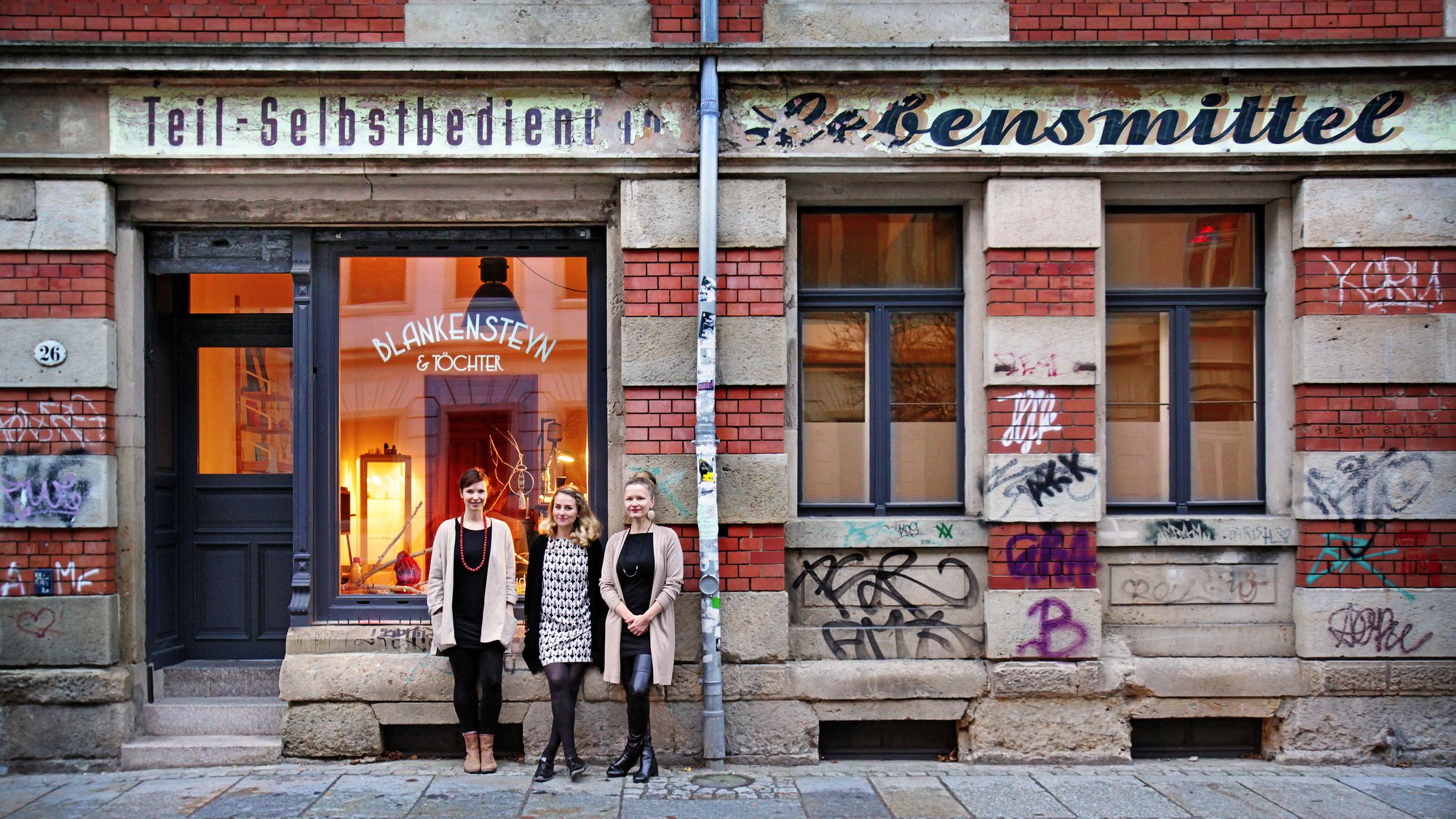 In den Räumen auf der Sebnitzer Straße war zuletzt ein Büro beheimatet. Früher gab es hier mal schwarze Scheiben mit Musik und ganz früher, also vor mindestens 25 Jahren, auch Lebensmittel beim Konsumverein „Vorwärts“. Und warum heißt das Lädchen nun „Blankensteyn & Töchter“? Das muss man die Damen schon vor Ort selber fragen.