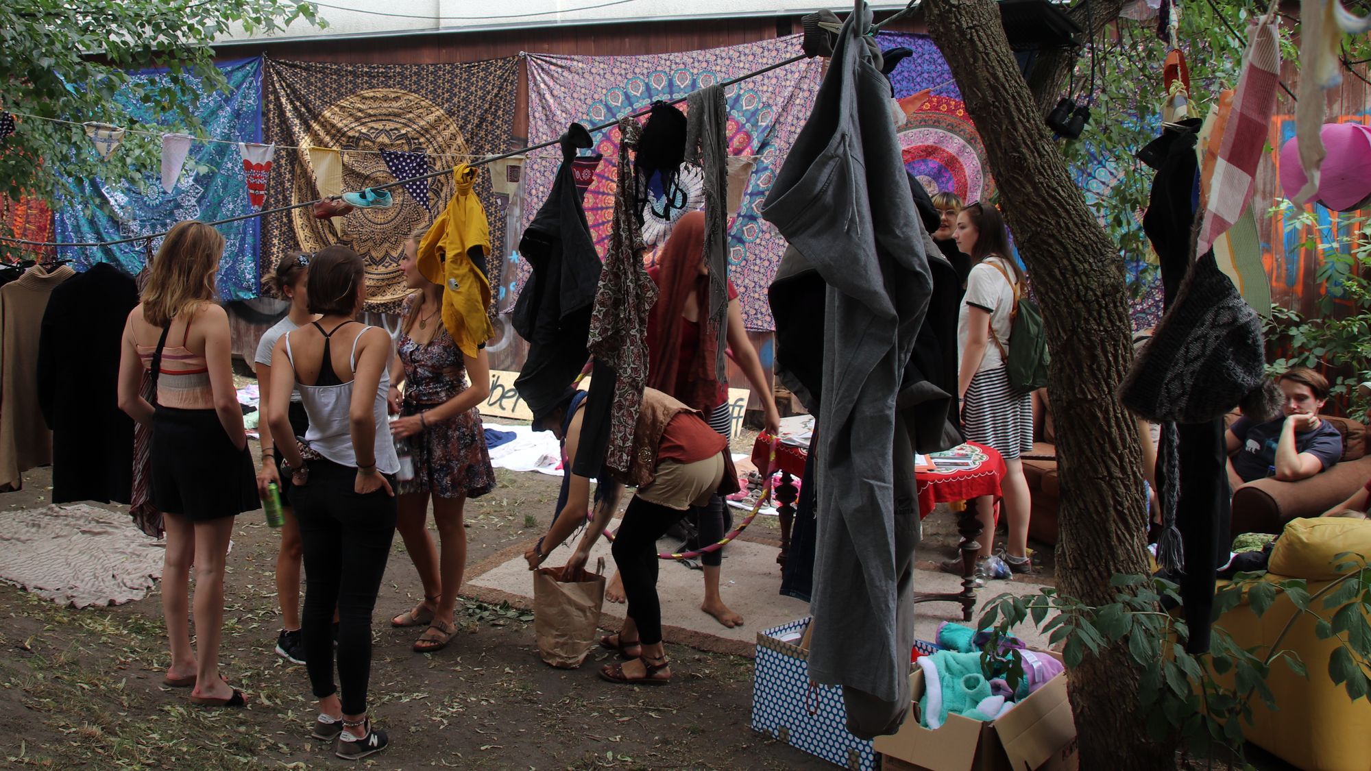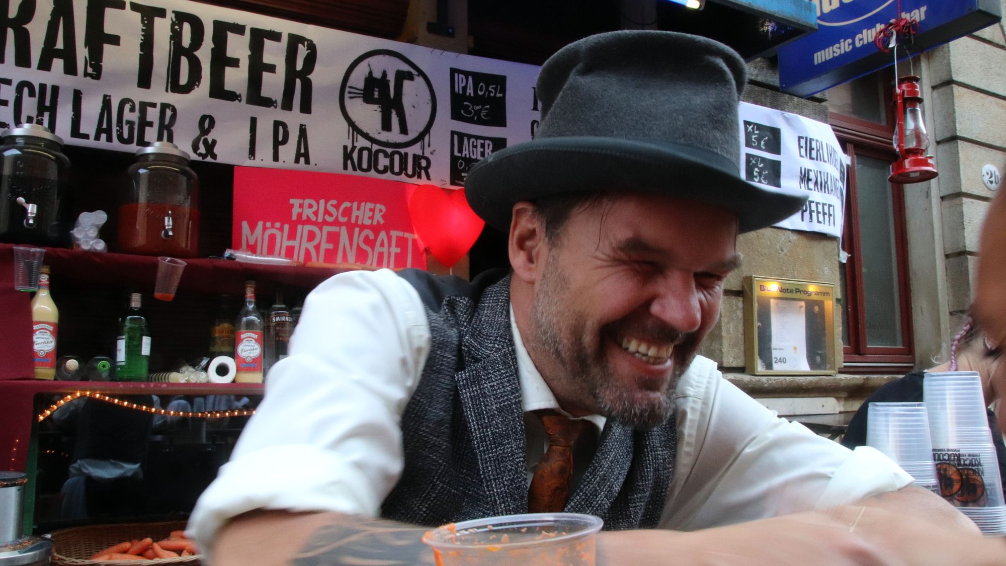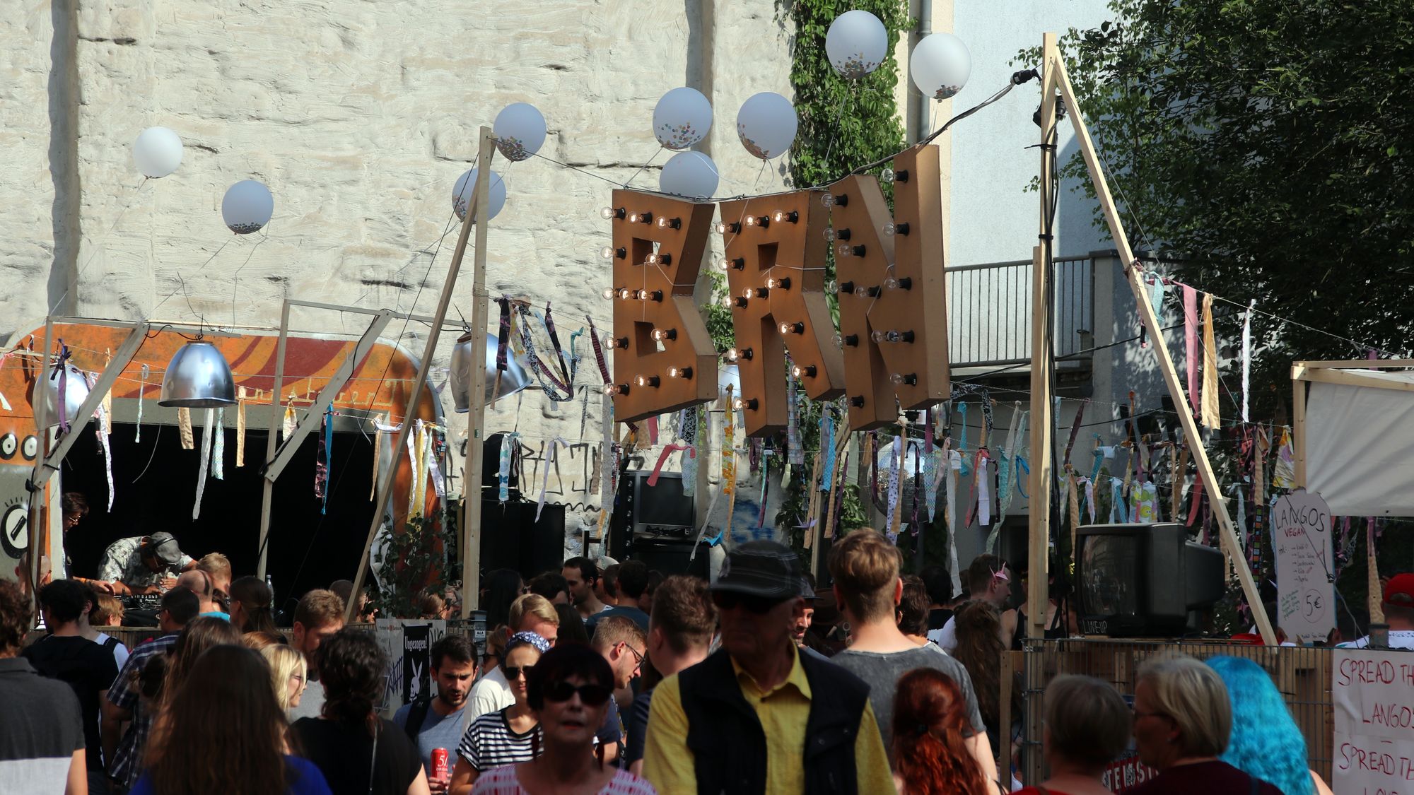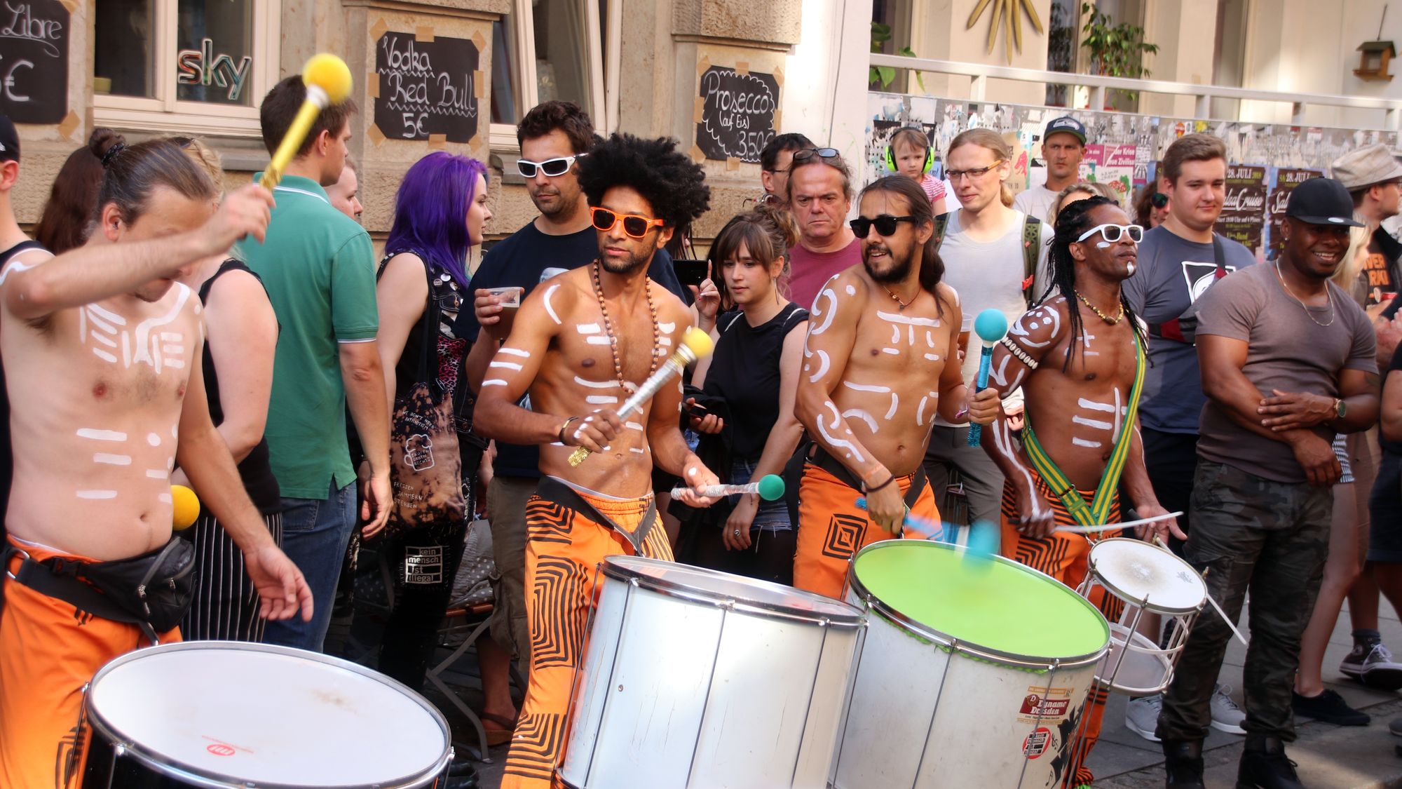 Die Ecke ist ohnehin ganz gut, nebenan die BRN-Tanzstube zeigt sich wunderbar und ein paar Schritte weiter gibt’s Pelmeni, russisches Bier und herrliche Rucksäcke mit der Aufschrift „Pegida ist so 1933!“ Humor ist, wenn man trotzdem lacht. Dann läuft mir auch noch Ezé über den Weg. Um 19 Uhr soll sein Konzert auf der Alausebim-Bühne sein. Die Vorfreude wächst.