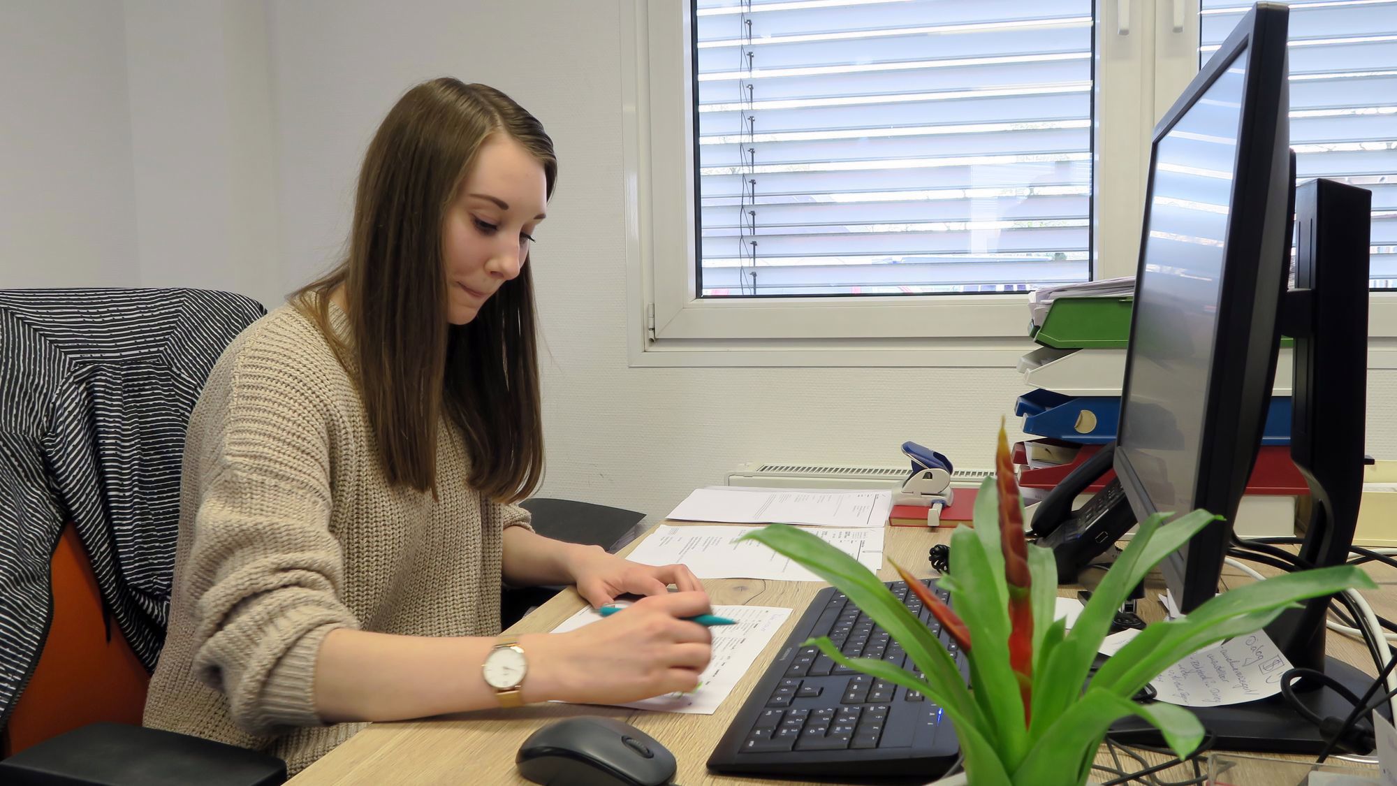 „Nette Kollegen“ – Caroline Roch fühlt sich KENTNER wohl.Das Unternehmen bildet aus. Aktuell lernen hier vier Auszubildende. „Wir brauchen immer Nachwuchs“, erklärt Matthias Kunze, deswegen sollen im Herbst vier weitere Azubis anfangen. Gesucht werden zwei Kaufmänner oder Kauffrauen für Spedition und Logistikdienstleistung und zwei Fachkräfte für Lagerlogistik. Mit einem guten Realschulabschluss hat man hier die besten Chancen künftig so einiges zu bewegen. Eine der Auszubildenden ist Caroline Roch, sie will Kauffrau für Spedition und Logistikdienstleistung werden. „Man braucht schon eine schnelle Auffassungsgabe, um die Aufgaben hier zu meistern“, sagt sie und lächelt. Computerkenntnisse seien auch nicht schlecht, und schwupps sind die Finger wieder flink auf der Tastatur.